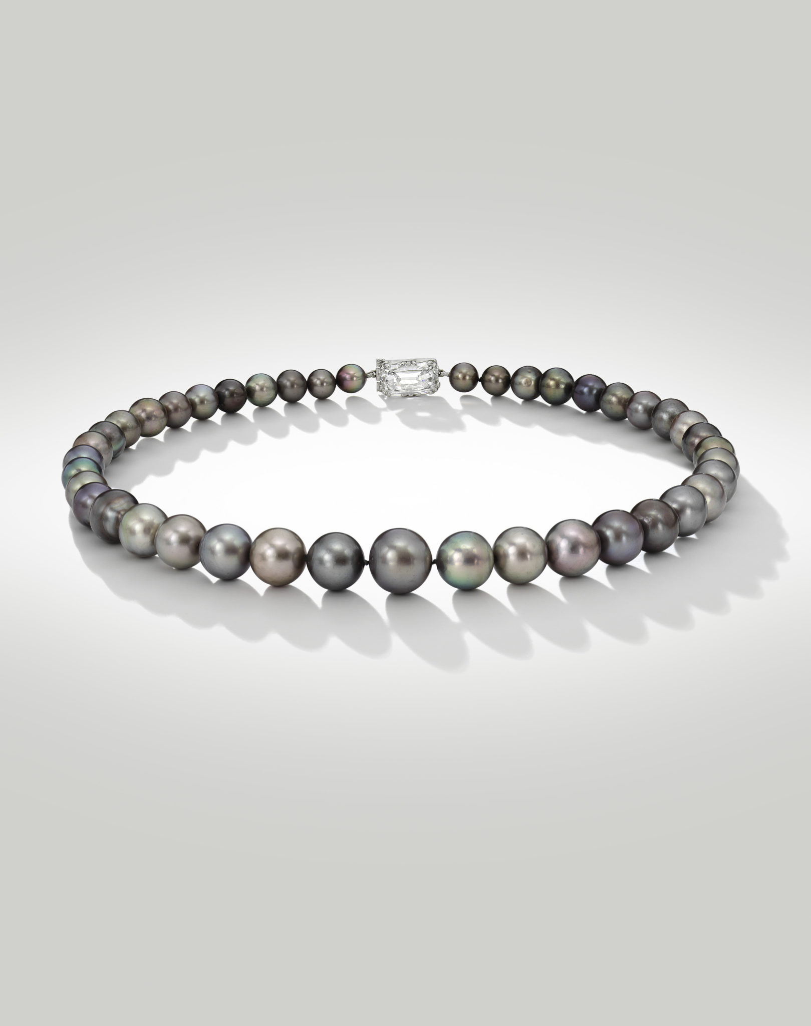 Già nella collezione della viscontessa Cowdray, Lady Pearson (1860-1932), illustre conoscitrice e collezionista, questa magnifica collana, montata da Cartier, si compone di 42 perle grigie di acqua salata estremamente rare, ben accostate per lucentezza, forma e dimensione ed è abbinata ad un paio di orecchini di perle grigie montate anch’esse da Cartier.