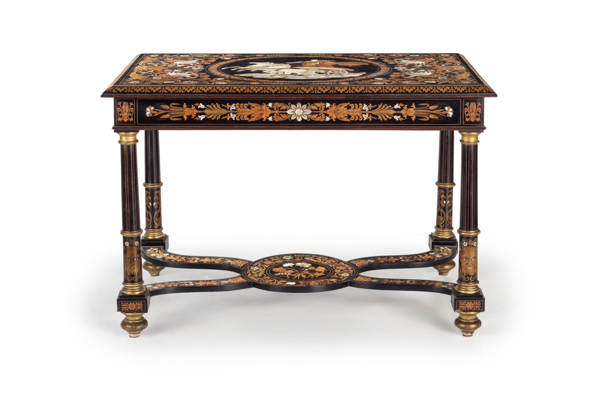 Tavolo da centro impiallacciato in ebano, legni vari, avorio, madreperla, Firenze, circa 1840-1855