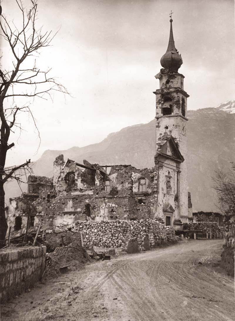 “Sui luoghi colpiti regna una grigia solitudine di rovine, ogni giorno che scorre leva come un nuovo lembo sull’estensione dei danni e scopre, in tanti angoli fuori di mano, le tracce della violenza, tanto più gravi quanto per lo innanzi meno avvertite. Sono un centinaio le chiese del Trentino che portano incisi a lettere di fuoco gli effetti terribili della guerra, e che giacciono diroccate o in uno straziante abbandono, spogliate di tutto l’arredo e di tutti i ricordi che intere generazioni, nel corso dei secoli, vi avevano raccolto a testimonianza della loro fede e della loro pietà” . Si apre con queste parole l’appello che la sezione trentina dell’Opera di soccorso per le chiese rovinate dalla guerra, costituita nel 1919 e diretta da don Vincenzo Casagrande, rivolse “a tutti i cuori gentili che hanno il coraggio di sacrificare qualcosa” per chiedere un contributo alla ricostruzione.