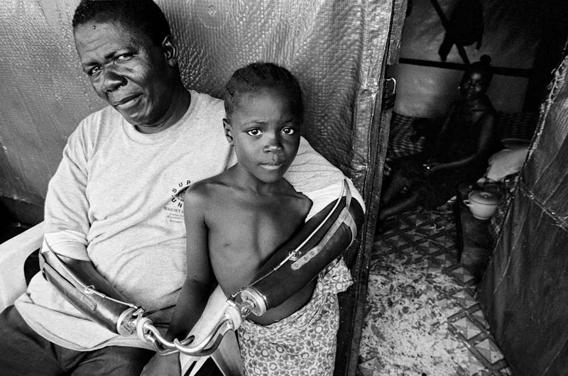 Le prime tavole della seconda parte del Miserere, quella più direttamente connessa al tema della guerra, vengono messe in relazione con le immagini scattate da Ugo Panella in Sierra Leone, un paese dell’Africa Occidentale segnato dal marzo 1991 al gennaio 2002 da una lunga e sanguinosa guerra civile. Furono decine di migliaia le vittime di questo conflitto e circa due milioni i profughi. Uno degli esiti più aberranti di questa guerra fu l’impiego in azioni militari di ragazzini tra i 10 e i 15 anni, drogati e costretti con la forza dai ribelli del Revolutionary United Front a diventare protagonisti di episodi estremamente cruenti. I ragazzini che camminano tra edifici bombardati nella regione di Kono, ritratti da Panella, forse sono quegli stessi bambini soldato, marchiati sulla fronte come bestie con la sigla RUF, carnefici e vittime al tempo stesso di una guerra che ne ha devastato l’adolescenza.