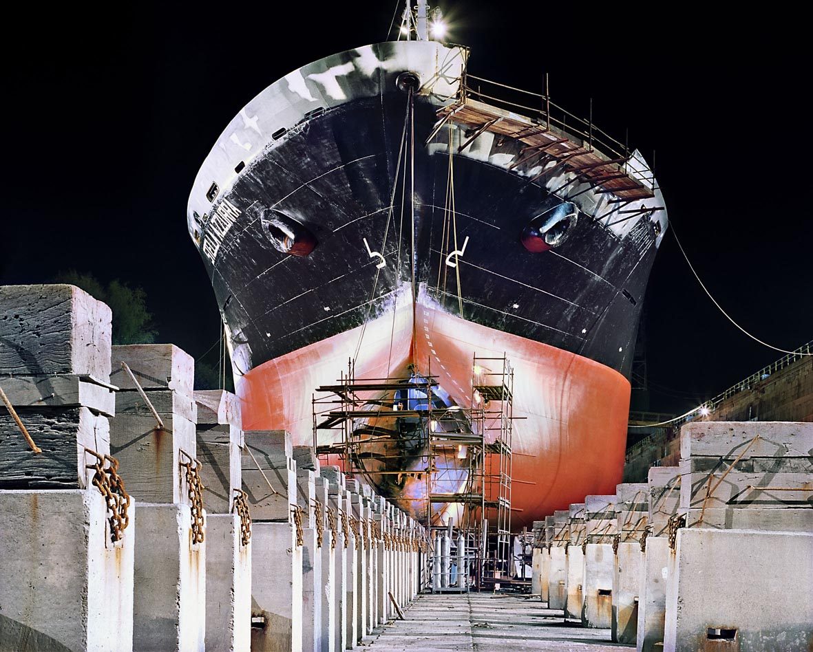 I dettagli sono enormi nella fotografia di Luca Campigotto. La prua di una barca occupa due terzi di un’immagine, il braccio di una gru taglia una foto in più segmenti, un cumulo di cavi è un’allusione a una nave di dimensioni gigantesche, i riflessi dei transatlantici in attesa dei loro passeggeri o le luci di un negozio fanno intuire le rispettive attività. L’orizzonte, distantissimo da questi primi piani incombenti, completa le informazioni sulla scena della fotografia.