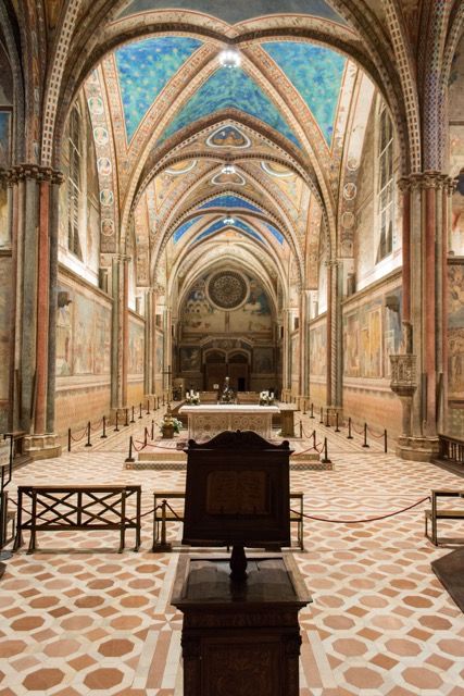 La Basilica Superiore, che svetta sull’impianto romanico e più cupo della Chiesa inferiore, è di stile gotico, realizzata con la tipica pietra rosa del Monte Subasio. Lo spazio interno si estende ampio e luminoso grazie agli ampi fasci polistili che tendono verso l’alto, ai costoloni di forma acuta e alle grandi finestre che corrono lungo l’aula della navata, nel coro e nel transetto.