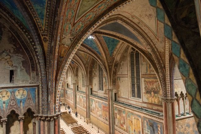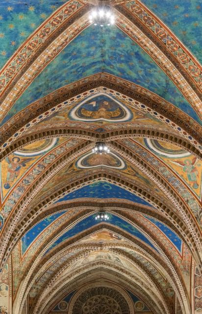 Destinata a diventare cappella papale e poi uno dei santuari più venerati della cristianità e meta tutt’ora di pellegrini da tutto il mondo, la Basilica Superiore fu inaugurata nel 1253 da Papa Innocenzo IV. Cimabue diede il via alla grande impresa della decorazione pittorica delle pareti basilicali, lavorando nel transetto, nella crociera e nell’abside, ma fu Giotto con la sua Scuola che nell’ultimo decennio del ‘200 dipinse le Storie di San Francesco nella navata, rivoluzionando definitivamente il modo di concepire lo spazio pittorico e le figure. In 28 riquadri raccontò la vita del poverello di Assisi, rendendo il racconto vivo ed emozionante grazie all’uso della prospettiva e alla resa tridimensionale dell’ambiente e dei personaggi.