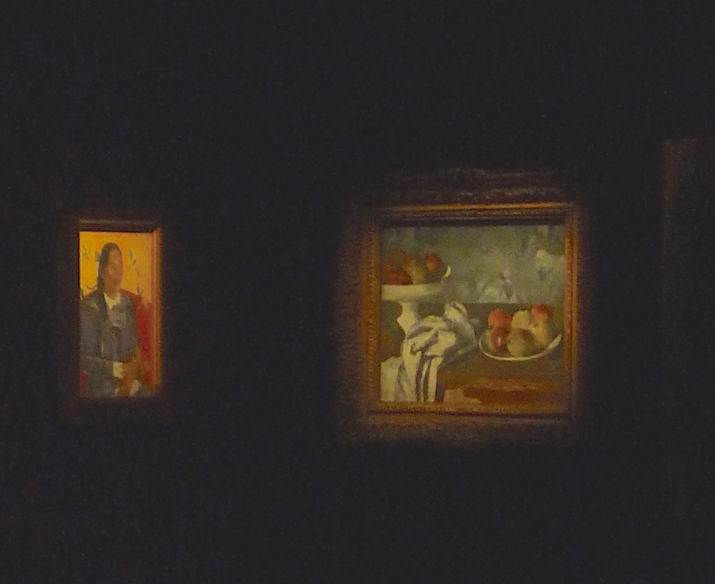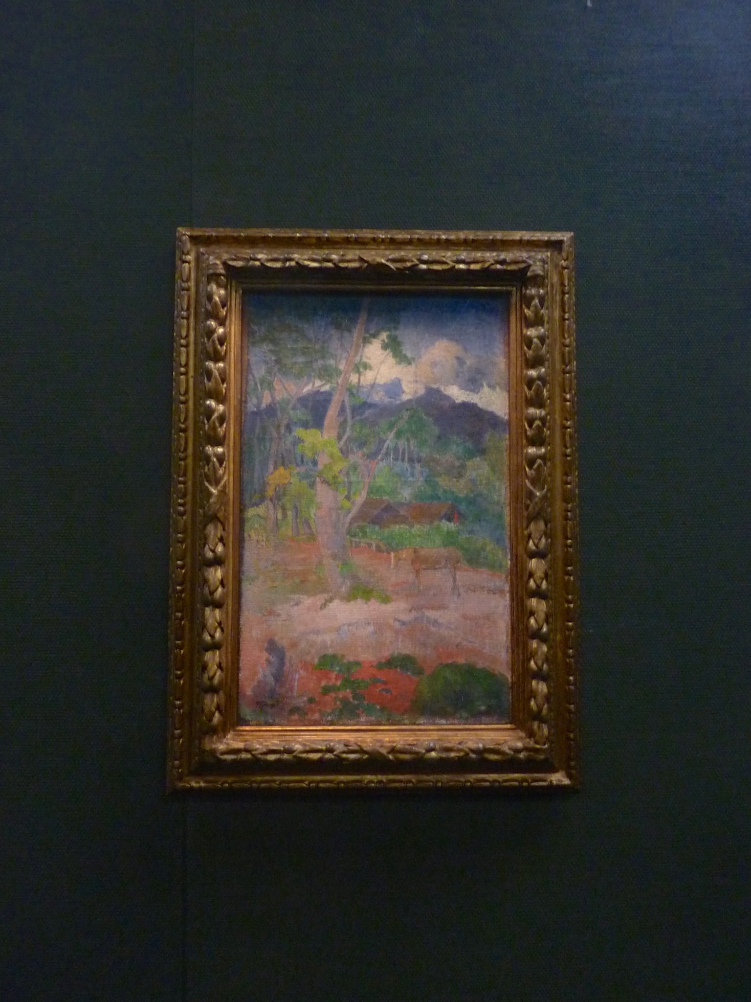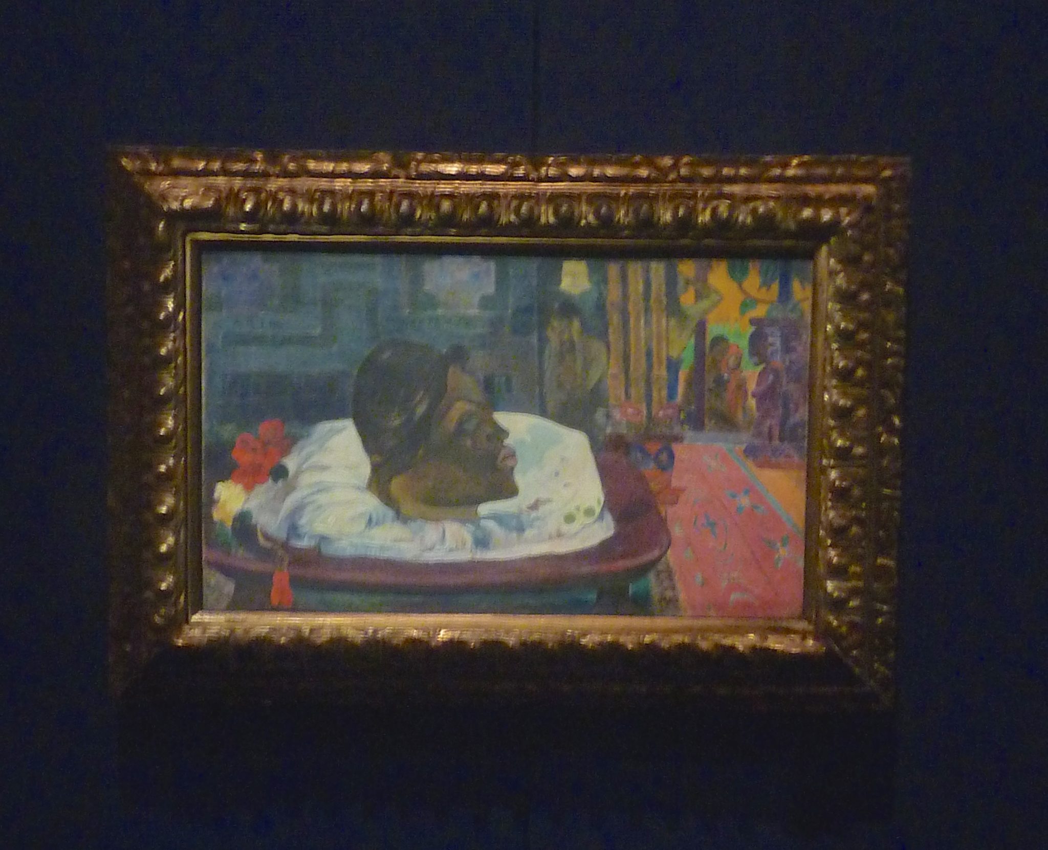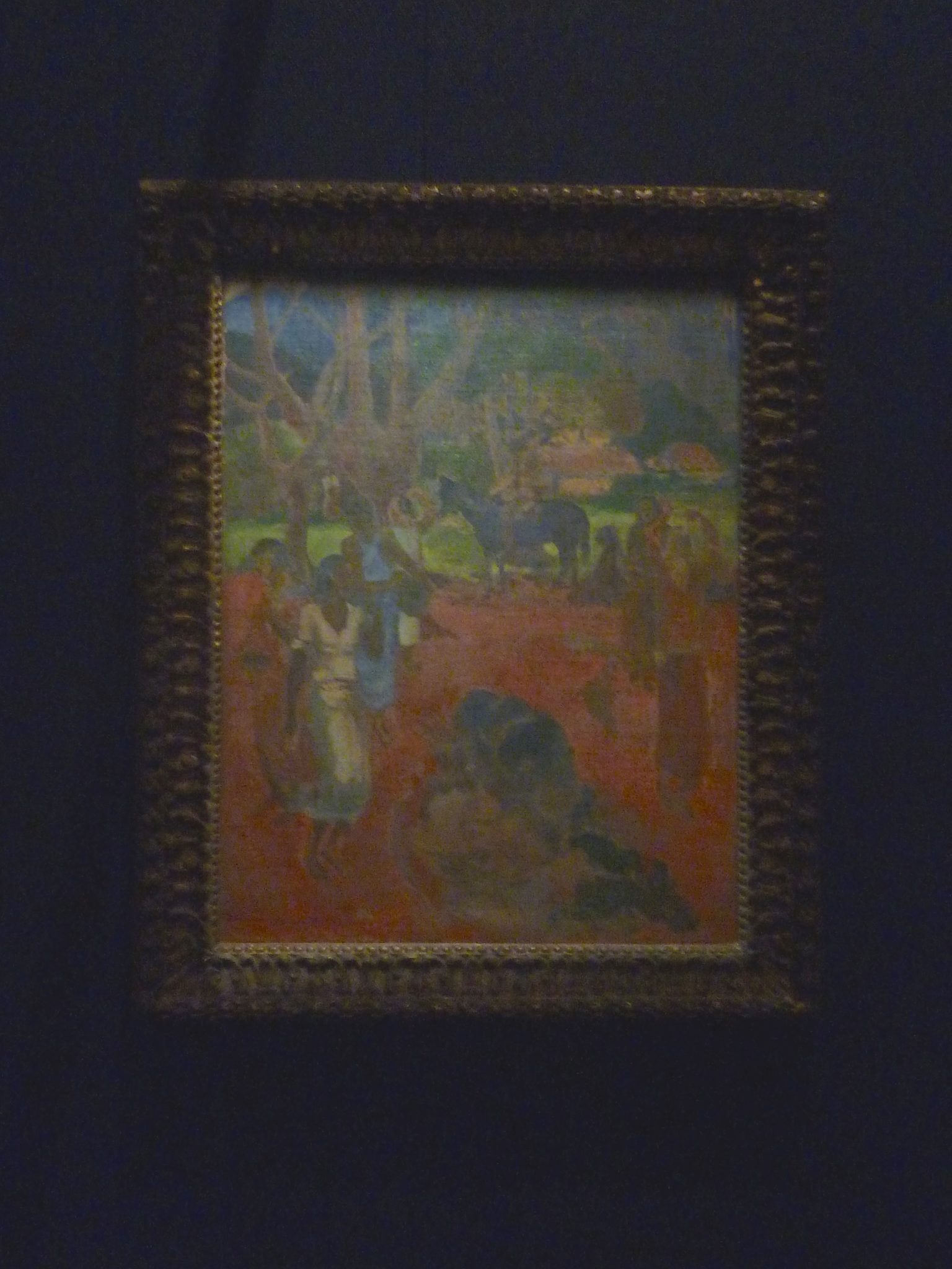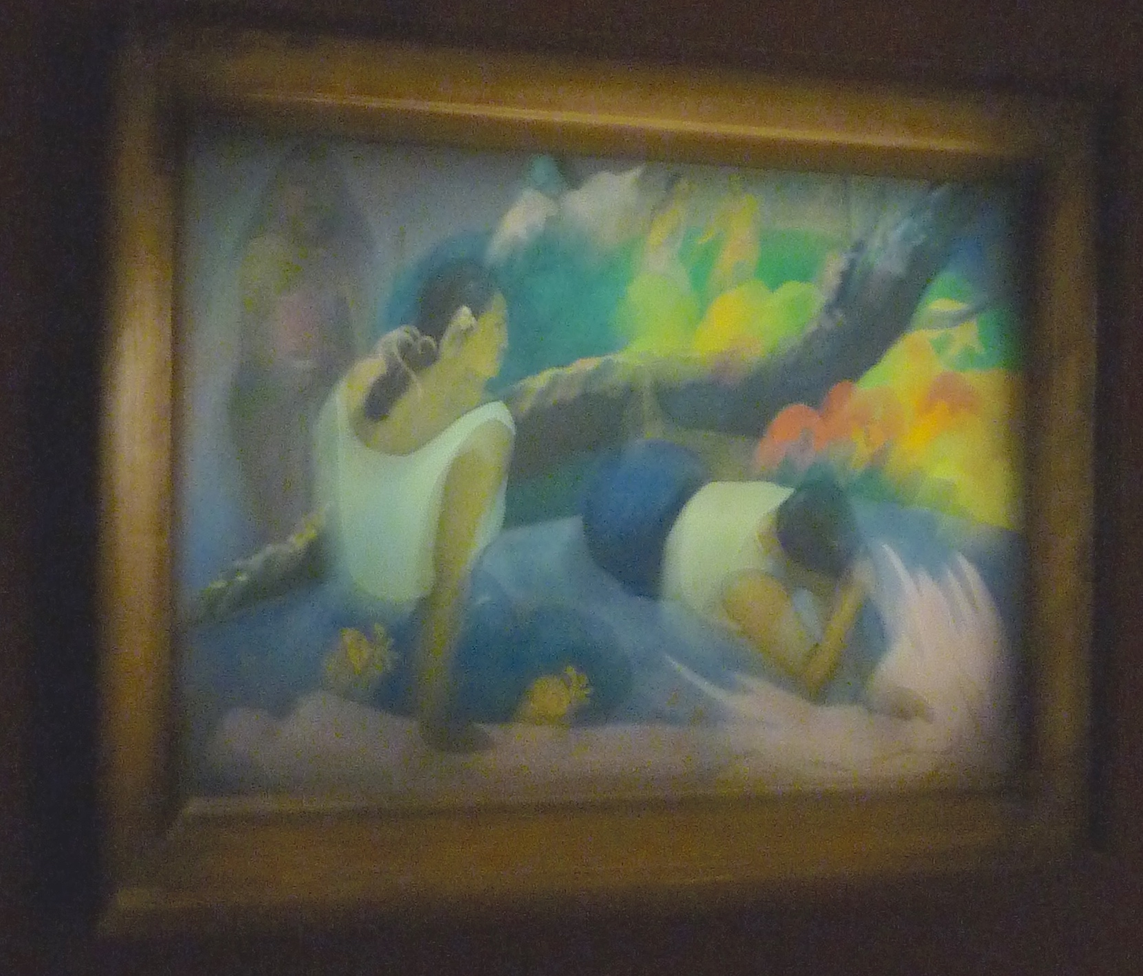 Le sinuosità di luci azzurrine del vetro opalino sul cielo del museo si calano nel mosaico cromatico della pozza su tela di “Mahana no Atua“. All’ombra (esclusivamente metaforica) del grande idolo, zampettano danzanti le giovani tahitiane l’upa upa proibito dal bianco invasore moralizzante. Bagliori di libertà che si sommano al pennello e al cervello di Gauguin. Le tre figure – Nascita, Vita, Morte – si aprono poco più sotto a ventaglio sopra l’oceano di colore in primo piano. L’onda di Hokusai sta arrivando e le figurine cavalleresche si stendono lontane sulla spiaggia. 1894: cifra stilistica compiuta, “racconti dal Paradiso” come recita il titolo. Made in Polinesia.