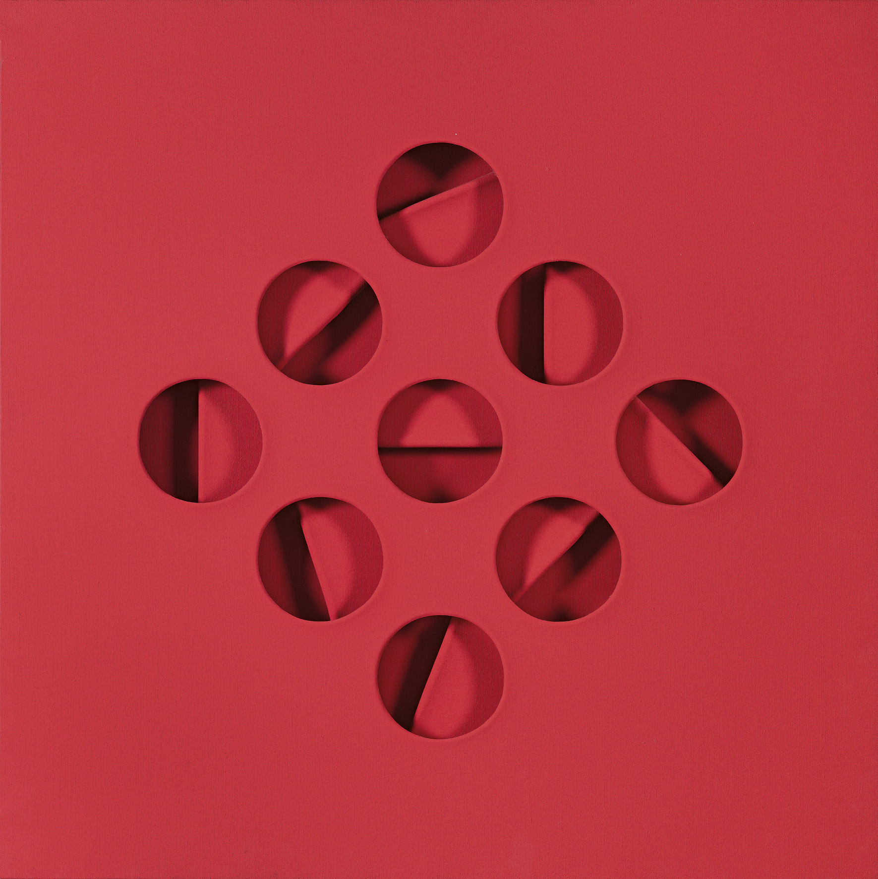 La stessa ricerca spaziale è evidente in due tele di Paolo Scheggi, “Per una situazione”, 1962 (€ 250.000 – 350.000) e “Intersuperficie curva, rossa”, 1967 (€ 300.000 – 400.000), nella grande “Superficie bianca”, 1986 di Enrico Castellani (€ 220.000 – 340.000), nel “Bianco” modulato di Agostino Bonalumi (€ 100.000 – 150.000) e nell’elegante “Segno bianco”, 1973 di Turi Simeti (€ 80.000 – 120.000).