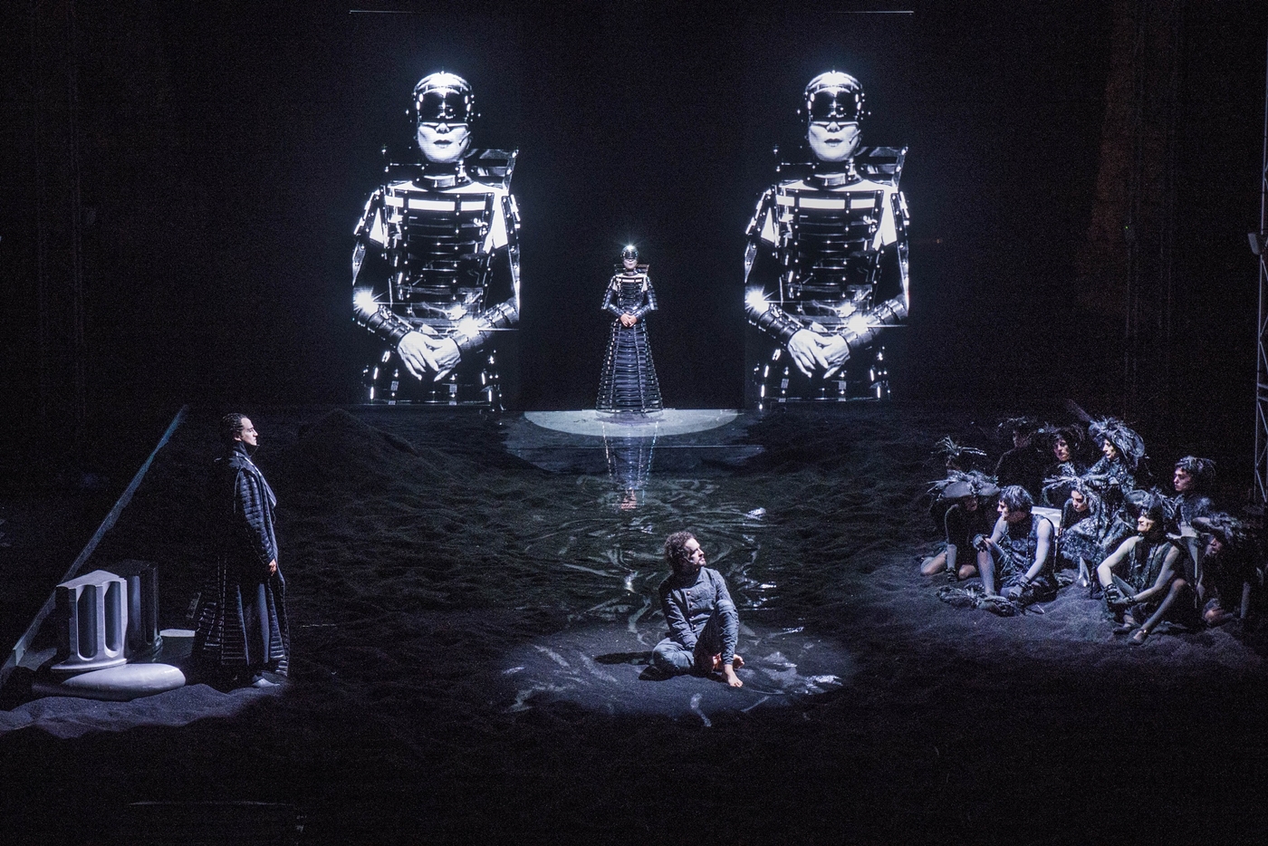 Il regista Luca De Fusco si confronta con una tragedia classica utilizzando, come nel teatro greco, la parola, il canto, la danza, a definire un linguaggio di teatro totale: “uno spettacolo – sottolinea il regista – per alcuni versi classico ma in realtà una messa in scena molto contemporanea, che rinnova lo stile di teatro/video già realizzato in Vestire gli ignudi, Antigone e Antonio e Cleopatra, nel quale si rinnova la felice collaborazione con gli artisti della Vertigo Dance Company di Tel Aviv”.