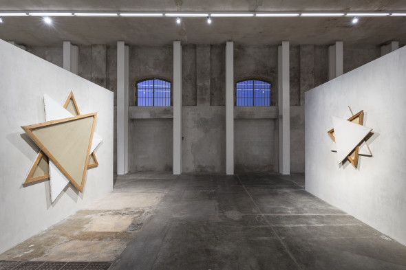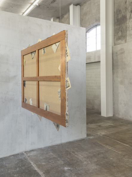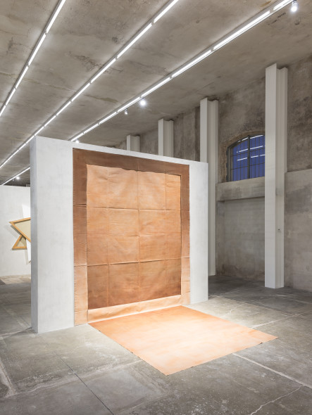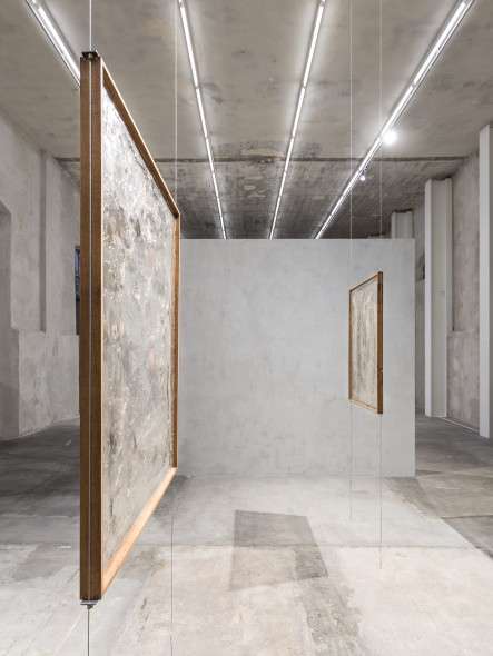 L’allestimento della mostra nella galleria Nord illustra il gesto del capovolgere e rivelare. Alcune opere sono sospese tra le pareti che dividono lo spazio espositivo. Grazie a questo procedimento i quadri, che normalmente sono presentati come entità piane e bidimensionali, diventano oggetti scultorei e tridimensionali attorno ai quali il visitatore può muoversi liberamente.