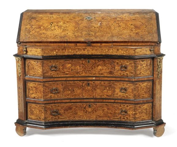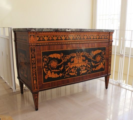 In ultimo, ma per questo non meni importanti ricordiamo gli arredi antichi che nei loro esempi più alti stanno riscuotendo grande attenzione da parte del mercato. Partiamo da una Ribalta lombarda in radica e legno ebanizzato della fine del XVIII secolo, per proseguire sempre nello stesso ambito geografico segnalando un bel Cassettone intarsiato in legni vari con piano in marmo verde della Bottega di Giuseppe Maggiolini. E’, invece, del XVII secolo e romano il Cassettone di grande impatto con piccola alza ripartita in cassettini, mentre la Coppia di piccole Consolles in legno scolpito, dorato e dipinto con piani, antichi, in marmo fior di pesco è genovese del XVIII secolo, da una Repubblica marinara all’altra, Venezia 1750, per ricordare la Coppia di monumentali cantonali intagliati e dipinti.
