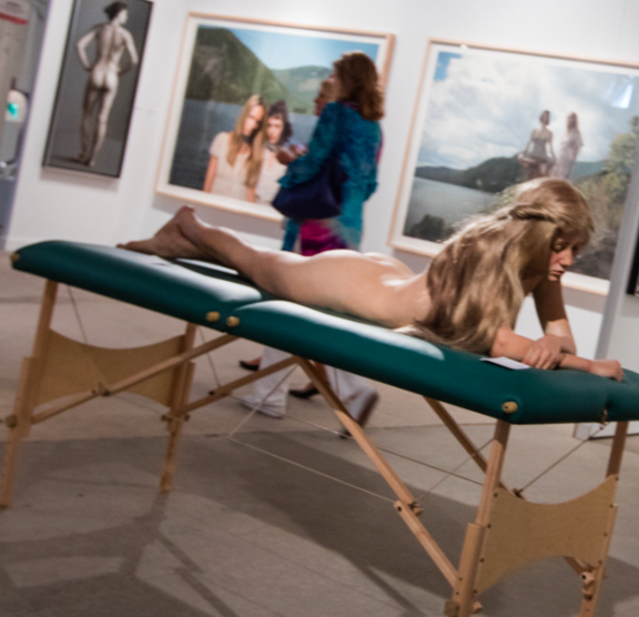 Calder, a small wire standing mobile dated 1969. The gallery also exhibited six vintage works by Salvador Dali; all museum quality and quite rare. Archeus has presented Antony Gormley’s Domain XV, (2000, stainless steel) that first appears to be an ambulatory “pick up stick” figure about 75 in. tall, which could have come right out of an animated science fiction movie. The imaginative construction on this work is simply magical, with barely a hint of how it was fabricated. Another work guaranteed to be a crowd pleaser is a notable life-size figurative polyvinyl work by John DeAndrea, who often is associated with the life-like human body imagery of Duane Hanson and George Segal. Presented by Meisel Gallery, De Andrea is now considered one of history’s great, living, photorealist/ hyper-realist sculptors.