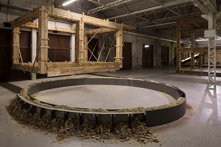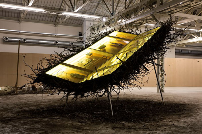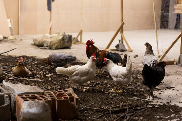 In quel dell’Hangar le coordinate spaziotemporali si sgretolano, così la mostra inizia ancor prima di iniziare. Fuori dall’edificio un razzo-pollaio si trasforma in una metafora di congiunzione fra esterno e interno, fra la realtà oggettiva del vissuto personale e il coraggio di trasformare il ricordo della fattoria dell’infanzia in un universo creativo assoluto e inimmaginabile.