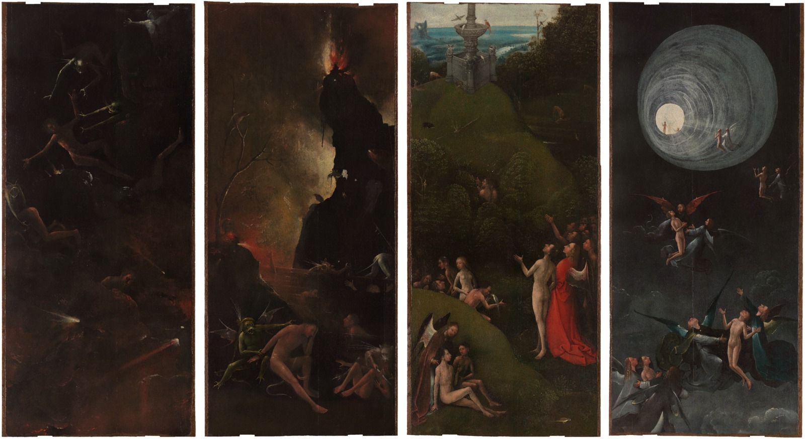 Il restauro dei quattro pannelli lignei delle Visioni dell’Aldilà, sottoposti a un intervento sulla superficie pittorica nel 2008, ha interessato invece il recupero pittorico dei “finti marmi” realizzati sul retro dei dipinti: consideratia lungo un’aggiunta posteriore non originale, grazie al restauro si sono rivelati essere uno dei rari esempi di questa originalissima stesura di Bosch giunta fino a noi (caratterizzata da una tecnica di“dripping paint”ante litteram) e quindi di particolare importanza, oltre che inedita al pubblico.