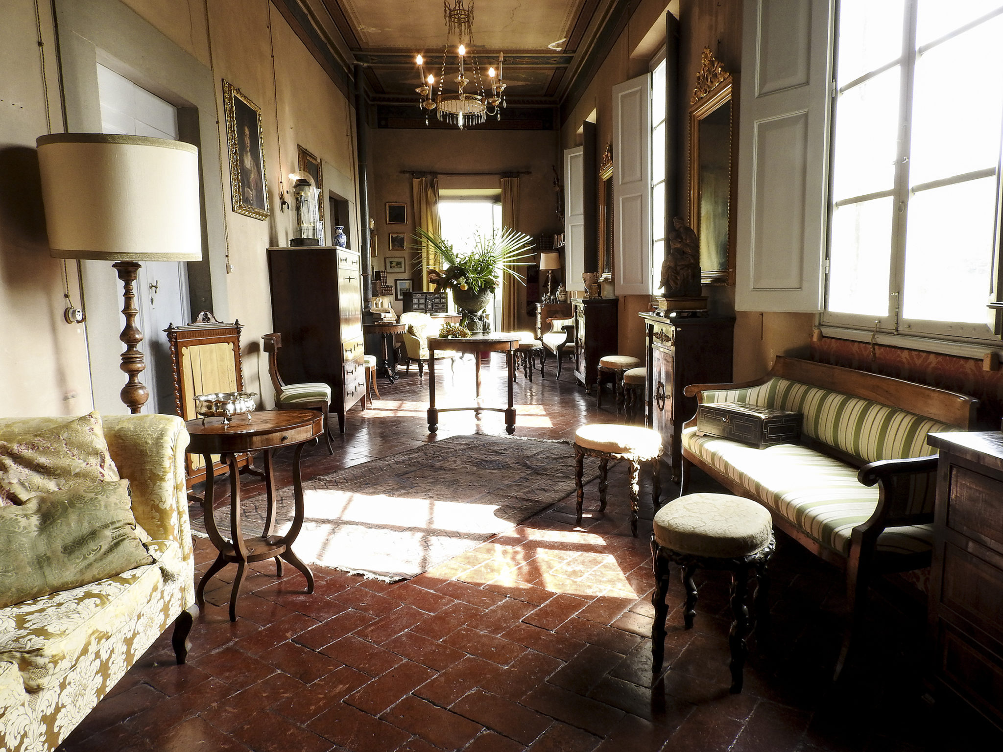 I grandi saloni, che si snodano al piano terreno ed al piano nobile, sono arredati con mobili, dipinti e suppellettili dal XVI al XIX sec., con una stratificazione di stili tipica di un’antica residenza tra campagna e città. Un ampio atrio si affaccia sul cortile che da accesso al parco e dove si accede alla sala da pranzo con un grande tavolo ovale in ciliegio della fine del Settecento corredato da dodici sedie coeve.