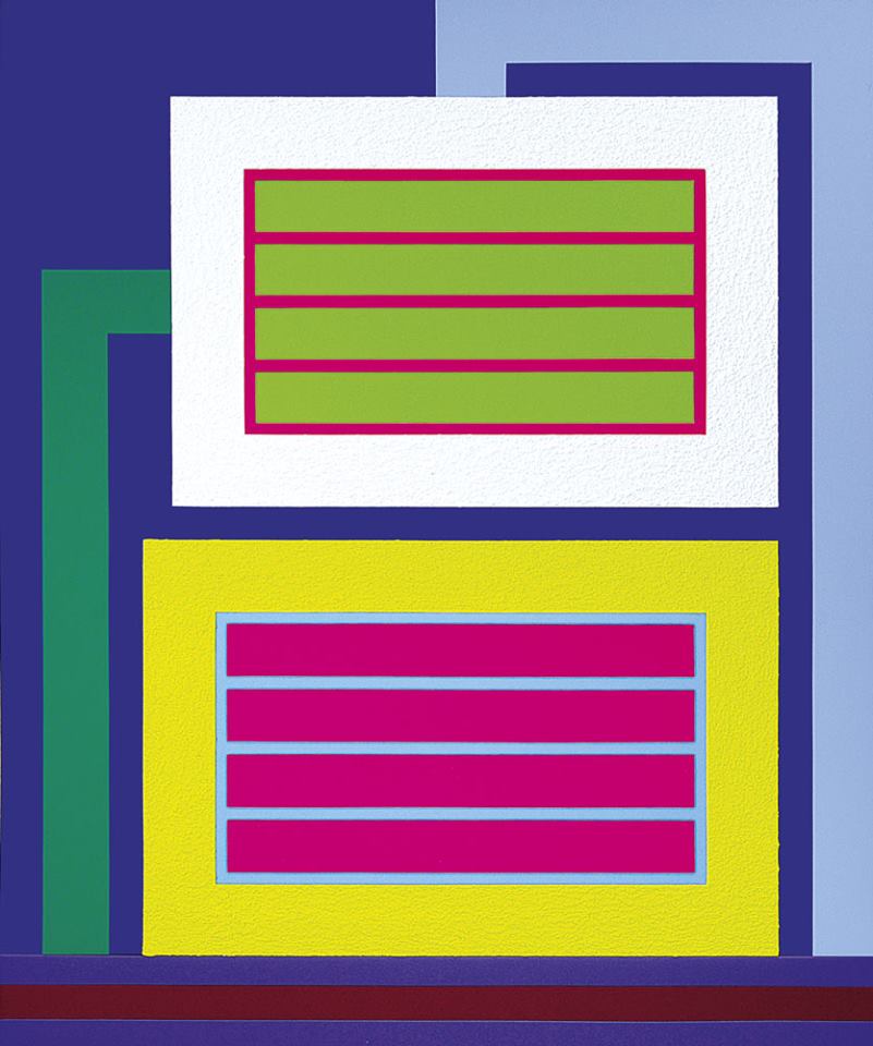 perspex colorato su tela cm. 90×180 (dittico), doppia firma e titolo al retro, etichetta l’Uomo e l’Arte Centro Arte Contemporanea e Primitiva (MI) al retro, opera registrata presso la Fondazione Mario Schifano come da dichiarazione su foto e certificato allegato, opera registrata presso l’archivio Mario Schifano (Roma) come da certificato di autentica e archiviazione con documentazione fotografica a cura di Monica Schifano allegato.