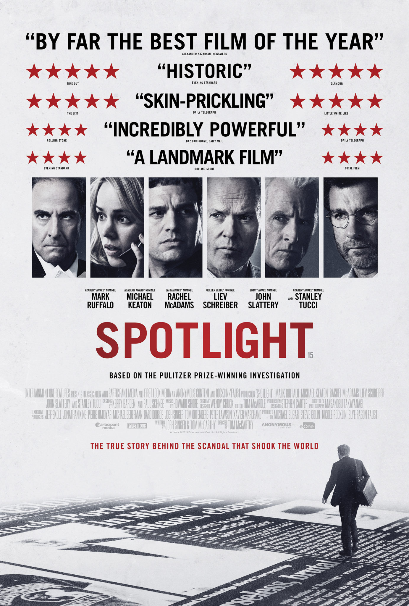 Presentato fuori concorso alla 72ª Mostra internazionale d’arte cinematografica di Venezia Spotlight è ora candidato a 6 premi Oscar: miglior film, miglior regia (Tom McCarthy), miglior attore non protagonista (Mark Ruffalo), miglior attrice non protagonista (Rachel McAdams), miglior sceneggiatura originale, miglior montaggio.