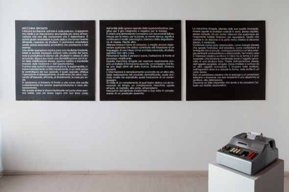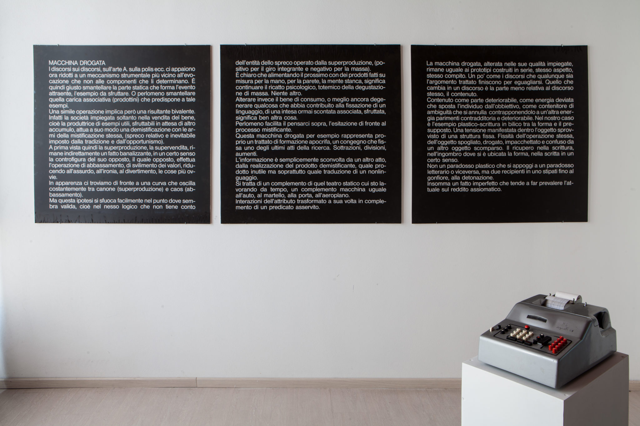 1968 Macchina drogata è un’operazione di teatro statico che si situa a cavallo tra tecnologia arte, critica del linguaggio e critica politica. Nella stessa stanza sono mostrate alcune opere prodotte dalla macchina che vivono vita propria, “sono”, indipendentemente dalla macchina che le ha create.