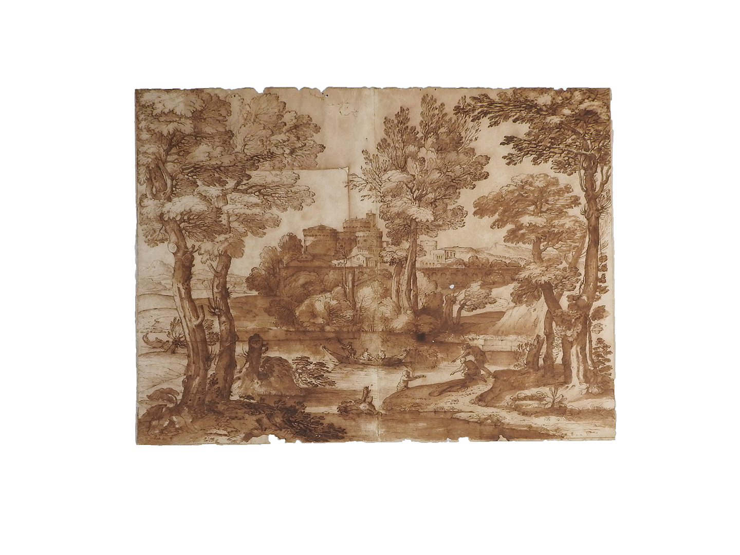 penna e inchiostro bruno, acquerello, biacca carta bruna, foglio centinato, mm 260×410