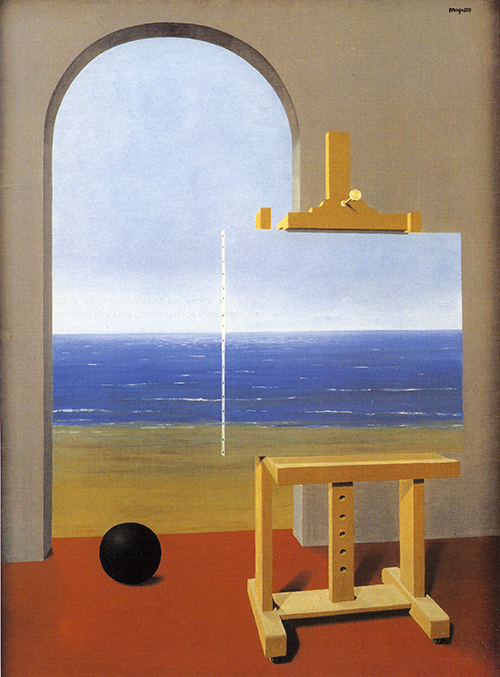 Ne La condizione umana II l’espediente è decisamente spiazzante: il rappresentato (il paesaggio?) ed il rappresentante (il quadro?) vengono a mescolarsi e a perdersi l’uno nell’altro. Il paesaggio non è il modello del quadro, bensì il paesaggio continua linearmente sul quadro, travasandosi da una parte all’altra dell’opera senza alcuna discontinuità.