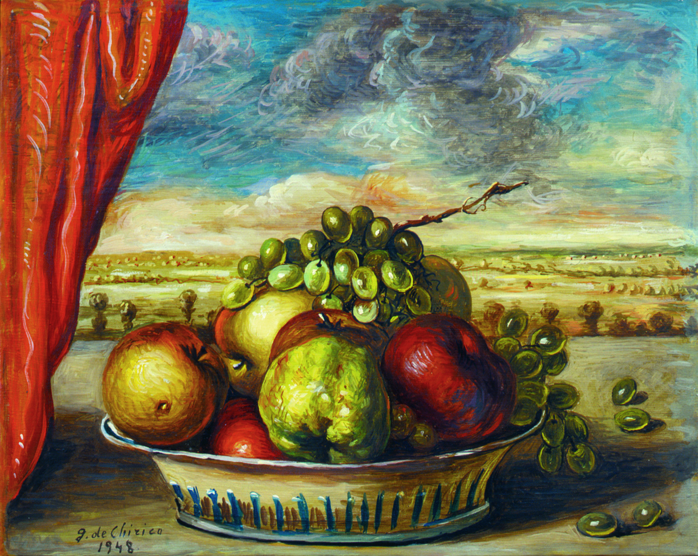 Giorgio de Chirico Natura morta nel paesaggio con drappo rosso, 1948