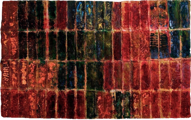 L’opera esposta in mostra appartiene al ciclo dei Kromogrammi, una sorta di alfabeto cromatico che sperimenta procedimenti di trasformazione metabolica di elementi naturali -kourkoum, ratania e altre essenze, tutti a forte valenza simbolica- secondo una precisa temporalità. I Kromogrammi, che costituiscono lo snodo teorico dell’intero percorso dell’artista, appartengono ad un ciclo di lavori iniziato a cavallo fra la fine degli anni ’60 e gli anni Settanta sul quale si fonda la sua ricerca e rappresentano un’importante chiave di lettura di tutta l’attività sviluppata nel trentennio successivo. Si tratta di grandi tele piegate in cui si susseguono, secondo un ordine ritmico, colori, materie e forme diverse, una sorta di architettura organica che si condiziona e si completa vicendevolmente. Non si tratta semplicemente di superfici dipinte, composizioni concluse, ma sono definibili “il risultato di una pittura fatta in assenza volontaria di pittura” (Paolo Fossati).