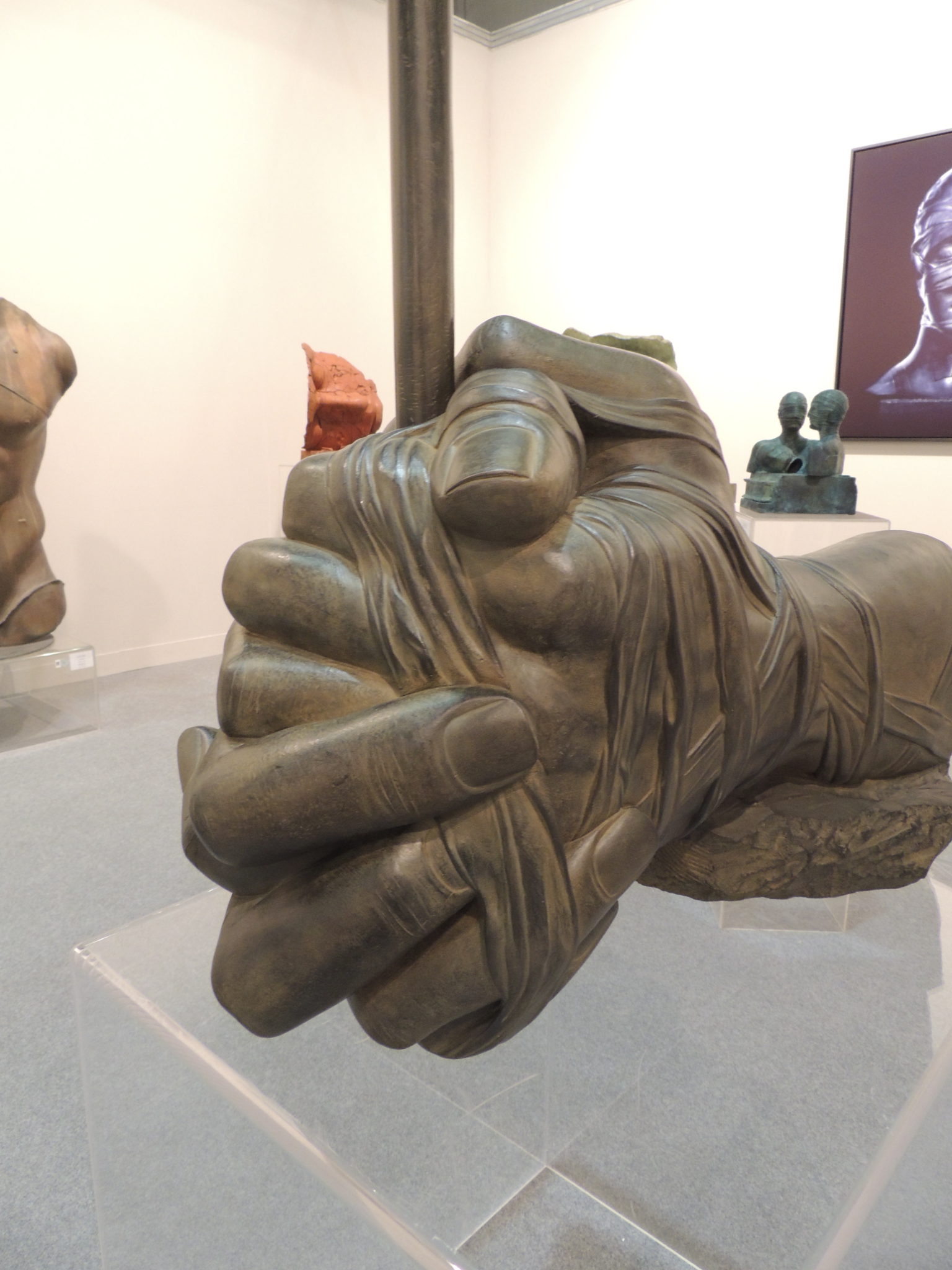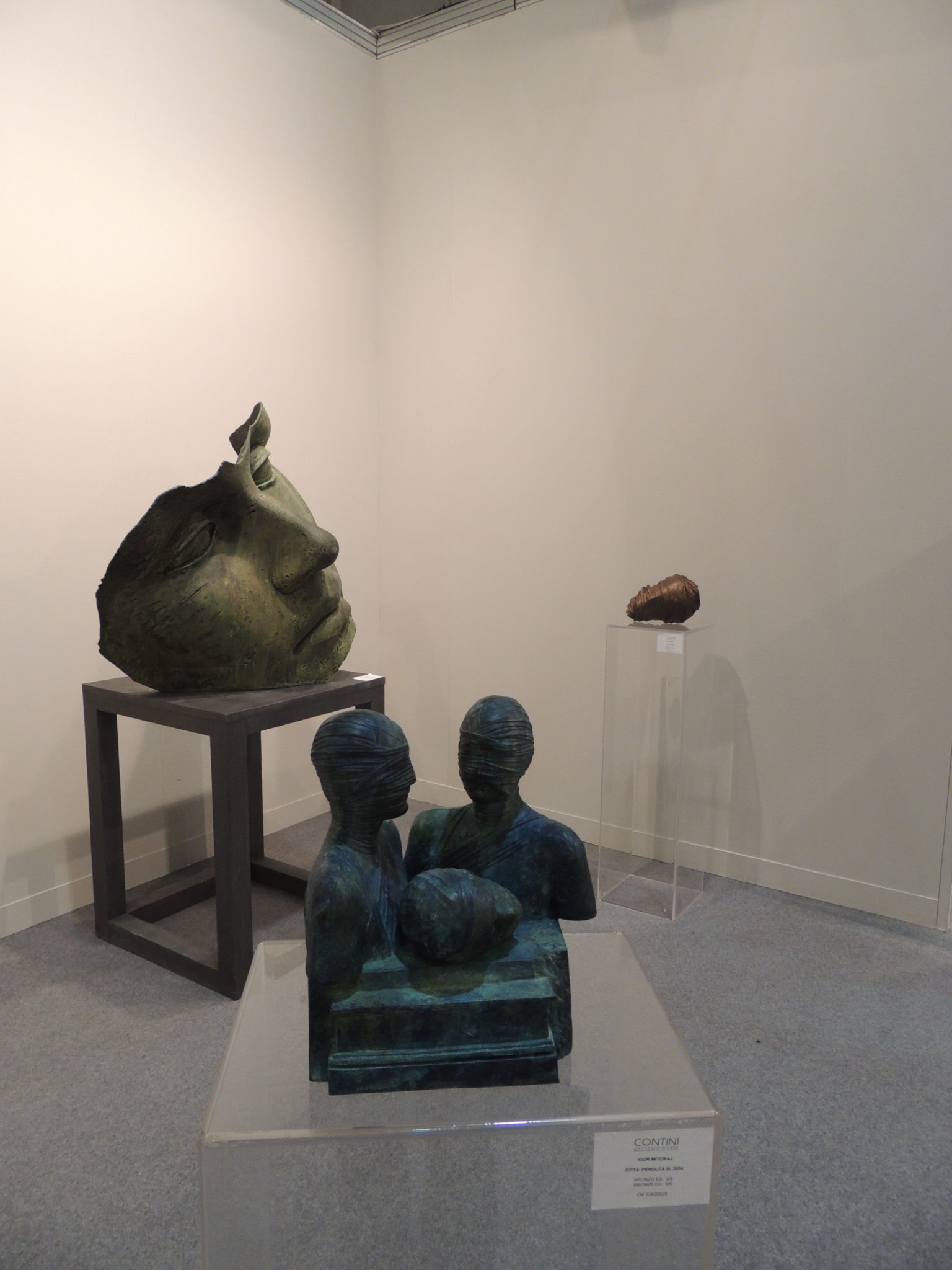 Poco oltre lo stand di Contini (Venezia, Cortina) che propone Botero, Marc Quinn e Christo, attualmente impegnato sul Lago di Iseo per il suo ultimo progetto Floating Piers (Project), e un intero angolo, con un allestimento molto ricco, dedicato allo scultore polacco Igor Mitoraj. Di fronte a Contini, la Galleria Blu (Milano) propone delle carte di Bonalumi che che si possono portare a casa con 20/30 mila euro.