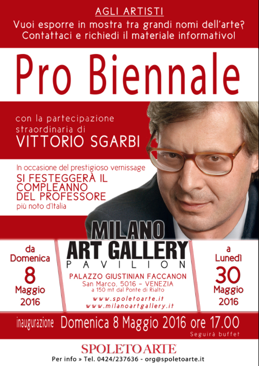 Inaugura domenica 8 maggio 2016, alle ore 17.00, con i festeggiamenti del compleanno di Vittorio Sgarbi, la seconda edizione della Pro Biennale presso Milano Art Gallery Pavilion, nel contesto dello storico Palazzo Giustinian Faccanon, antica sede del quotidiano Il Gazzettino, situato a Venezia, a pochi passi dal Ponte di Rialto.