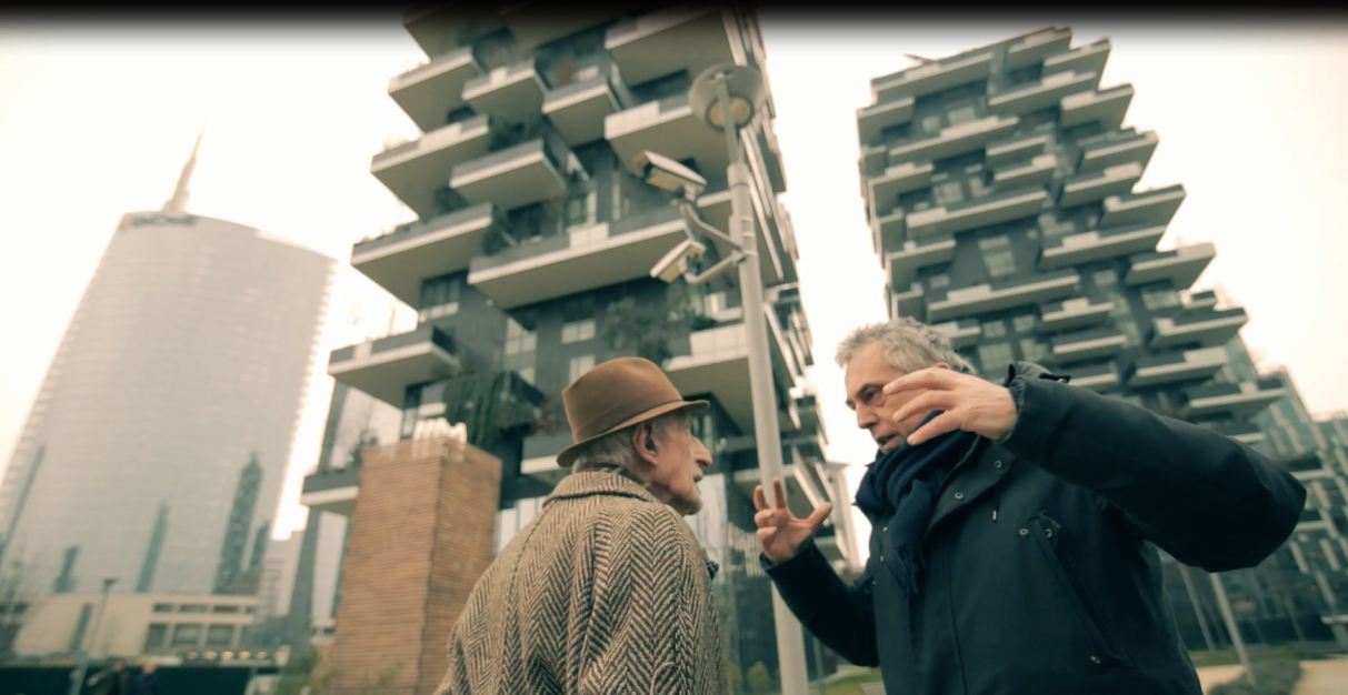 Ora, proprio l’architetto milanese fa da cicerone al maestro Gillo Dorfles, 106 anni appena compiuti tra i massimi talenti critici ed eclettici di sempre, in un tour verde-verticale all’interno della sua creatura vetro-vegetale alternata a pannelli di ceramica e alluminio nero. Prima di addentrarsi nella struttura uno sguardo da fuori per mirar l’opera nel complesso e valutarla nel contesto. Boeri e Dorfles naso all’insù vista balconi sfalsati, tiranti e giardini pensili. Vista corbezzoli, ginestre e biancospini con edera piombante: vegetazione che crescendo si incastra a tetris completando il doppio tappeto verticale: schermo vegetale a cui è affidato il compito di creare un adeguato microclima e filtrare la luce solare, prontamente colonizzato da volatili – con annessi nidi e pellegrini volanti in cima – e insetti. 160 esemplari approssimativamente tra uccelli e farfalle. Una vera e propria “facciata vivente” che riveste l’edificio: un’interfaccia attiva per l’ambiente circostante, sintesi di un’architettura che demineralizza le superfici urbane utilizzando la mutante policromia delle foglie per le sue facciate. Specie colorate e chiassose collocate sul lato sud, piante spoglianti a nord. Col passare delle stagioni le torri si tingono così di colori sempre diversi, dal fresco pastello primaverile ai toni caldi d’autunno.