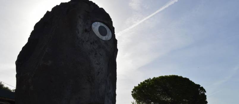 L’opera di Lello Esposito, Gli occhi del Vesuvio, è una maschera di Pulcinella di 45 tonnellate in pietra lavica. Il soggetto è l’elemento che contraddistingue la produzione dell’artista napoletano, che ha rappresentato Pulcinella in diverse sembianze e contesti, ma, in questo caso, la maschera ha due enormi fori che incorniciano la vista mozzafiato, che si gode sulla sommità del vulcano.