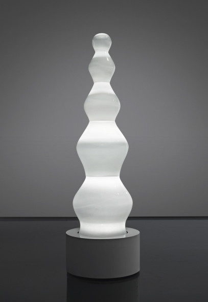 La luce è da sempre un fattore essenziale nell’arte, sia in senso estetico sia trascendentale. In alcune delle opere in asta, la luce è il tema dell’opera stessa. Spettro di luce bianca è una scultura di Otto Piene, che appartiene alla serie delle „Sculture elettriche in vetro“. L’opera, in vetro opaco, è composta da quattro pezzi singoli, il cui volume si assottiglia progressivamente in senso verticale. La lampada incandescente nascosta nella base, invia un impulso di luce verso l’alto, secondo un tempo di intermittenza stabilito dall’artista e, attraversando le forme di vetro soffiato crea diverse gradazioni di bianco e di luce. La scultura acquista così una propria vita, con evocazioni spettrali, sottolineate anche dal titolo dell’opera (€ 230.000-280.000).