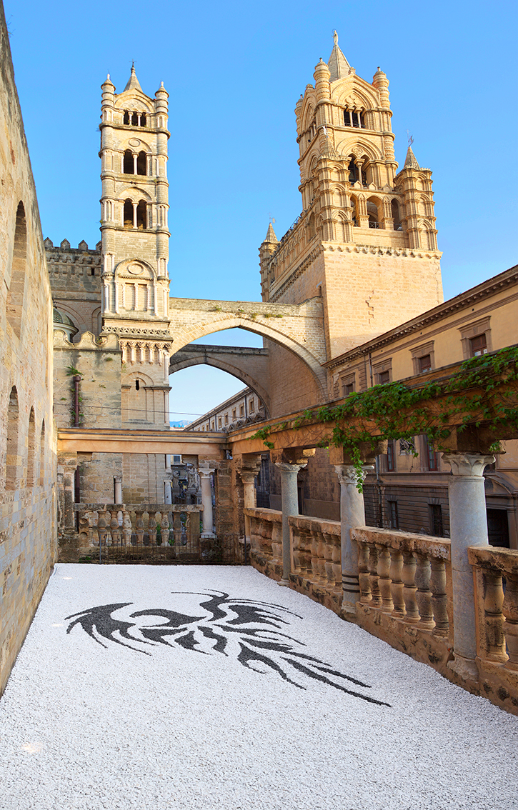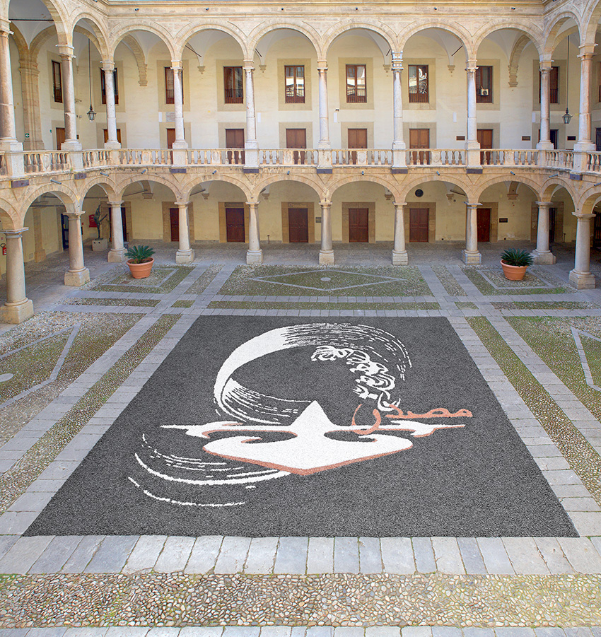E a Palermo, in occasione della proclamazione come patrimonio Unesco dei siti arabo-normanni, Palazzo Reale e il Museo Riso hanno collaborato alla realizzazione della mostra. Che presenta tre grandi installazioni pavimentali, una serie di progetti preparatori, una scultura lignea e il Ritratto di Federico II, e che consente così ai visitatori di percorrere il tradizionale itinerario con una rilettura contemporanea grazie ai lavori dell’artista. Oltre che a Palazzo Reale, le opere saranno visibili nel cortile Maqueda, nella Cappella, nella Cripta e nella Loggia dell’Incoronazione, e nella grande vetrina esterna di Palazzo Belmonte Riso.