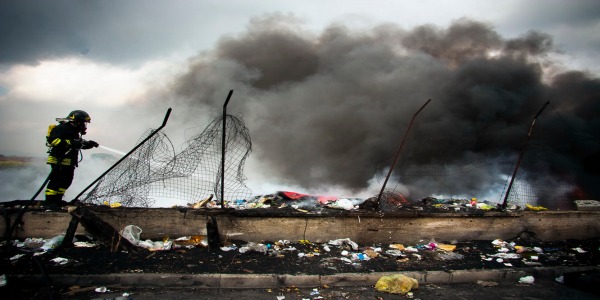 Caivano (provincia di Napoli- febbraio 2012- Un vigile del fuoco impegnato a spegnere un rogo appiccato a rifiuti speciali e urbani. Nella cosiddetta Terra dei Fuochi basta spulciare i documenti dei Vigili del Fuoco ,dove sono registrati i tantissimi interventi dei pompieri per i roghi tossici, per capire la portata del fenomeno relativo ai roghi tossici. Da molti anni, la camorra e le piccole imprese che producono in nero e sono costrette a smaltire i rifiuti in nero, usa il sistema dei roghi tossici per liberarsi dei rifiuti e degli scarti industriali di ogni tipo.