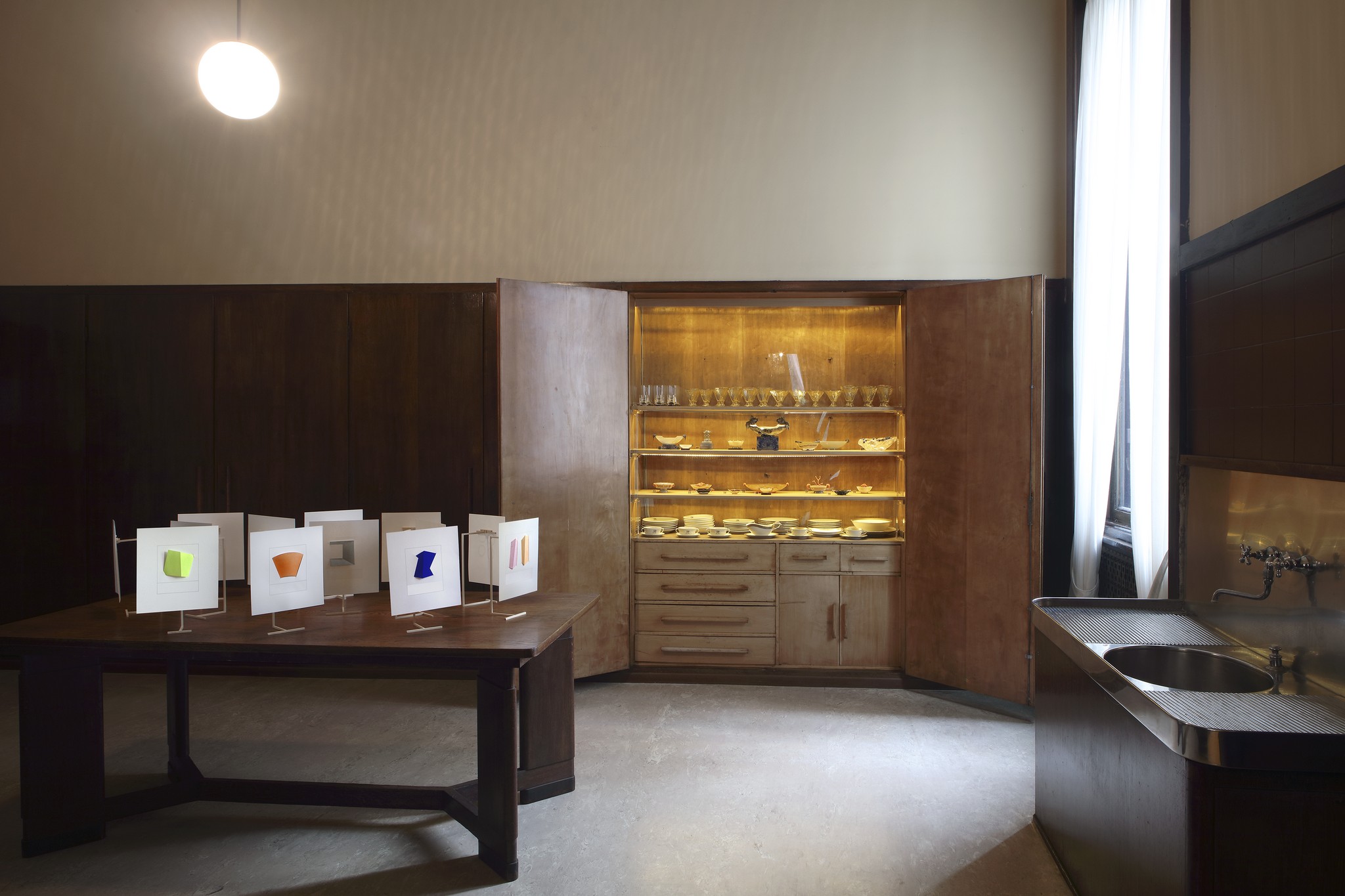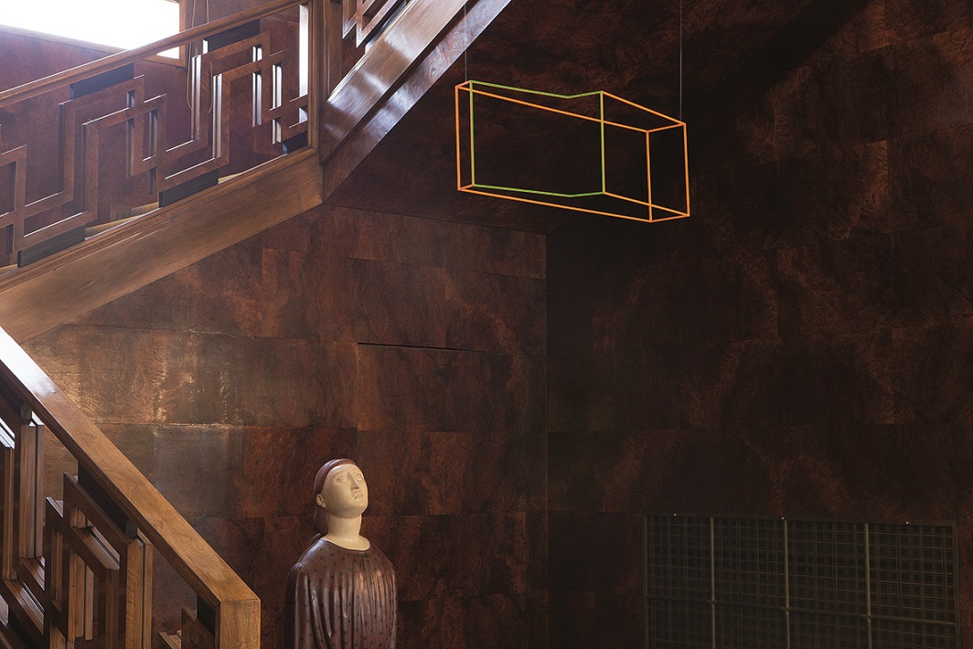 Le installazioni pensate per l’interno si confrontano invece con gli interventi dell’uomo – ovvero le fratture costituite dalle cose, che interrompono la continuità dello spazio, e dalle aperture, porte e finestre che negano la conclusione dello spazio – e mirano a rendere evidente la presenza fisica del vuoto e come la sua descrizione abbia bisogno di una quarta dimensione, quella del tempo necessario a percorrerlo, attraversarlo, viverlo e condividerlo. A partire dalla struttura senza peso e quasi invisibile appesa nella hall sopra la scultura L’amante morta di Arturo Martini, in grado di intercettare lo sguardo, per continuare poi con le carte ritagliate disposte senza ordine nell’office che sembrano galleggiare in aria e che, se guardate girandogli intorno, diventano disegni tridimensionali.