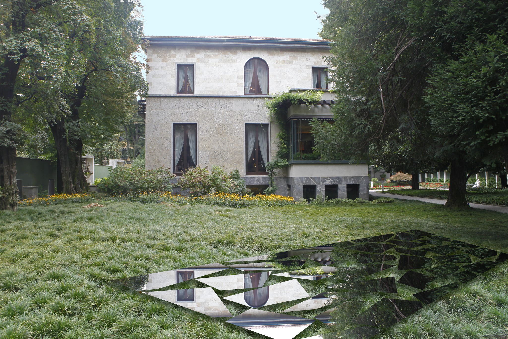 Le installazioni esposte sono state ideate da Davide Pizzigoni per dialogare con lo spazio e con la vocazione dei luoghi in cui sono collocate. Le opere in giardino hanno come riferimento la natura e l’architettura esterna dell’edificio. L’elemento unificante è lo specchio, materiale in grado di mostrare un’ulteriore realtà in cui le parti – ovvero le cose e il loro riflesso – si scambiano, per poi unirsi e quindi nuovamente scambiarsi, come in una danza. Ha un valore programmatico la prima opera che si incontra: un tappeto costituito da frammenti di specchio che riflettono la chioma degli alberi e tra i quali affiora il prato.