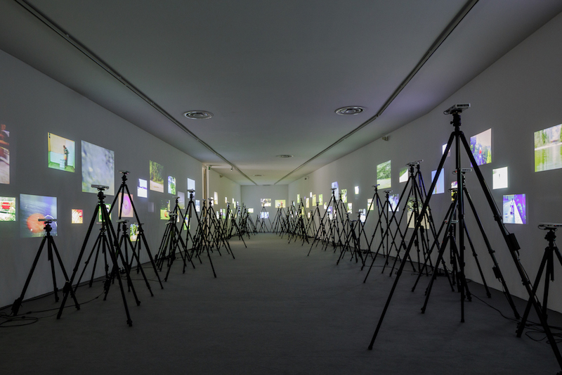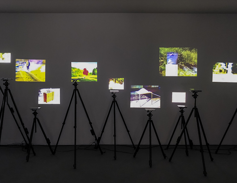 Cento proiettori su cavalletti, regolati ad altezze diverse, ridisegnano il perimetro dello spazio espositivo, mentre le quattro pareti si prestano come schermo per oltre duecento filmati. Il display è impeccabile, nonostante il rischio di risultare caotico fosse dietro l’angolo. Girati in Super 8 tra il 1975 e il 1989, i film – ora digitalizzati – documentano l’insolito lessico scultoreo, che l’artista cominciò a comporre a partire dalla seconda metà degli anni Sessanta.