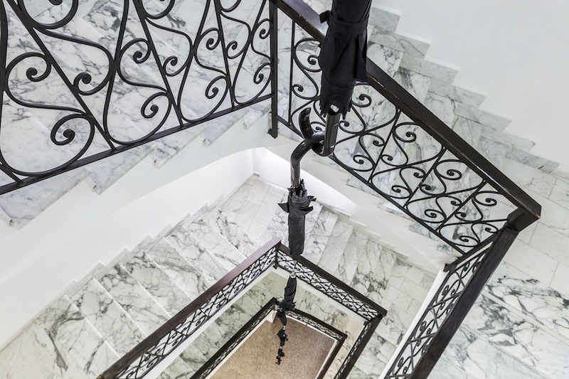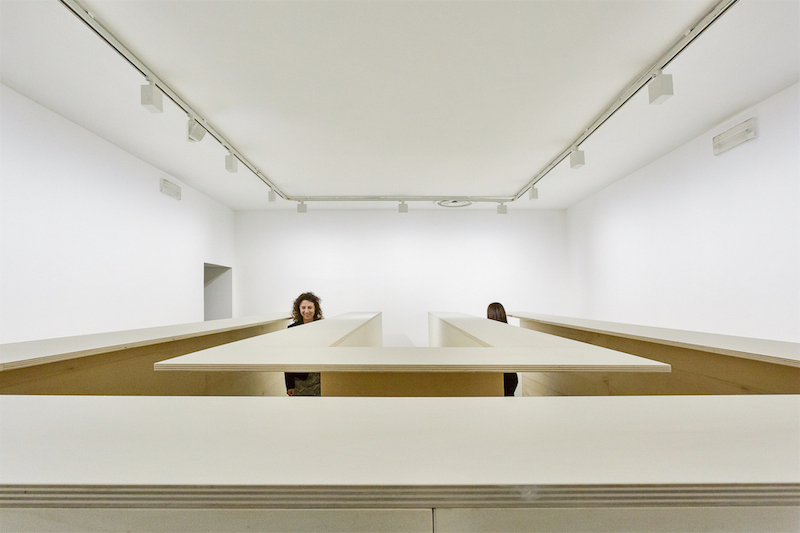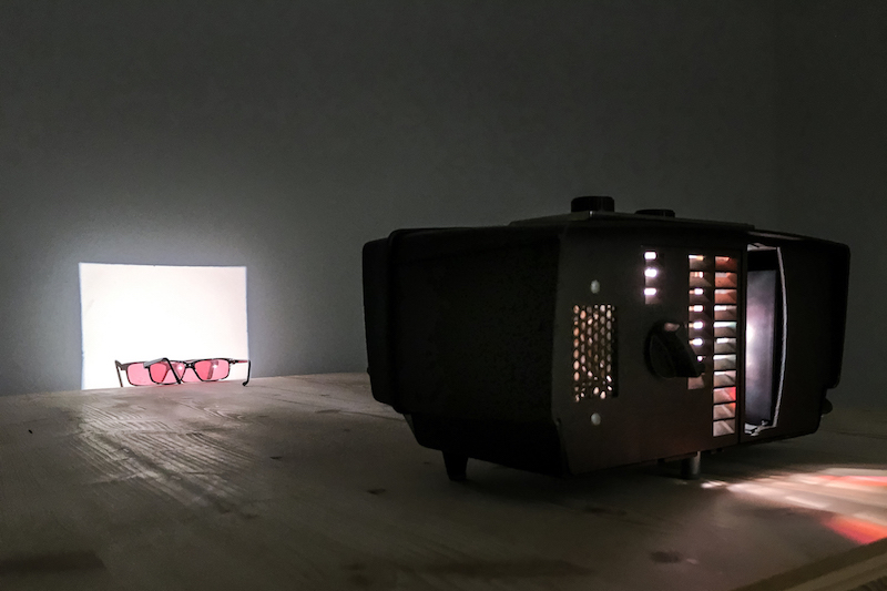 Nella tromba delle scale, svettano, agganciati uno all’altro, una serie di ombrelli, stabili poco più di un castello di carte: un gioco, un divertissement visivo, come lo è anche Installazione (2016), un piccolo labirinto in legno, rispetto al quale il pubblico può scegliere se osservare o essere osservato, percorrendolo; mentre Occhiali (2016), ingombra lo spazio del rumore di un proiettore Super 8, ideale accompagnamento sonoro ai film visibili nella sala principale.