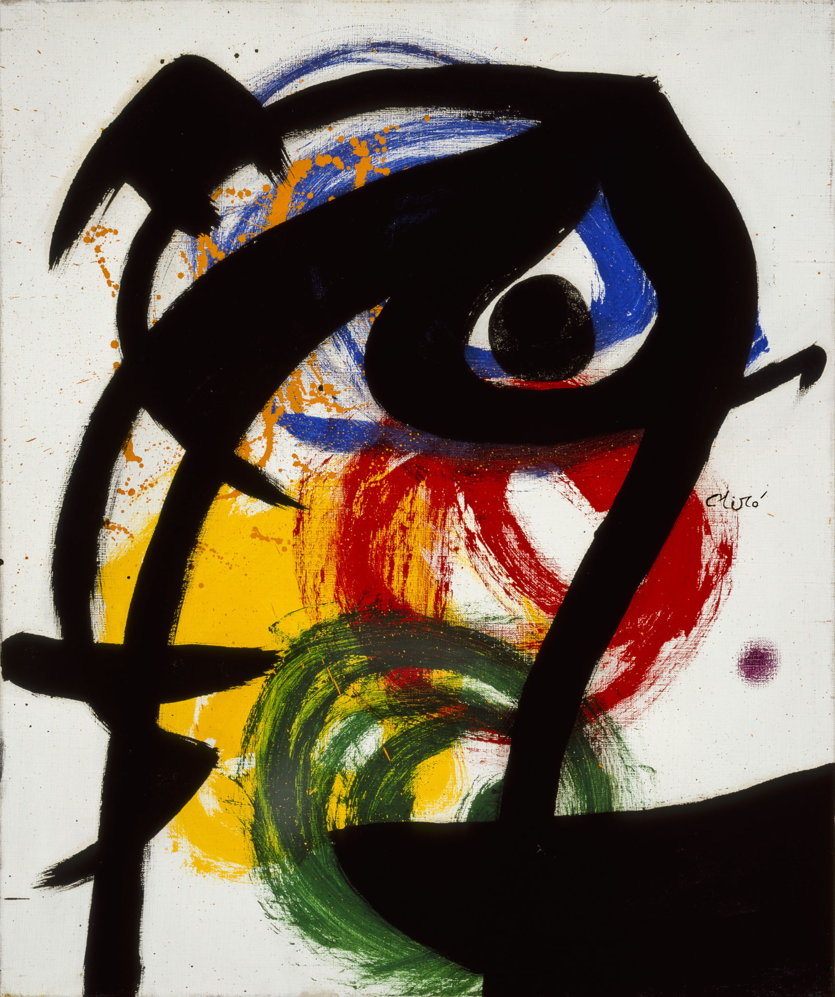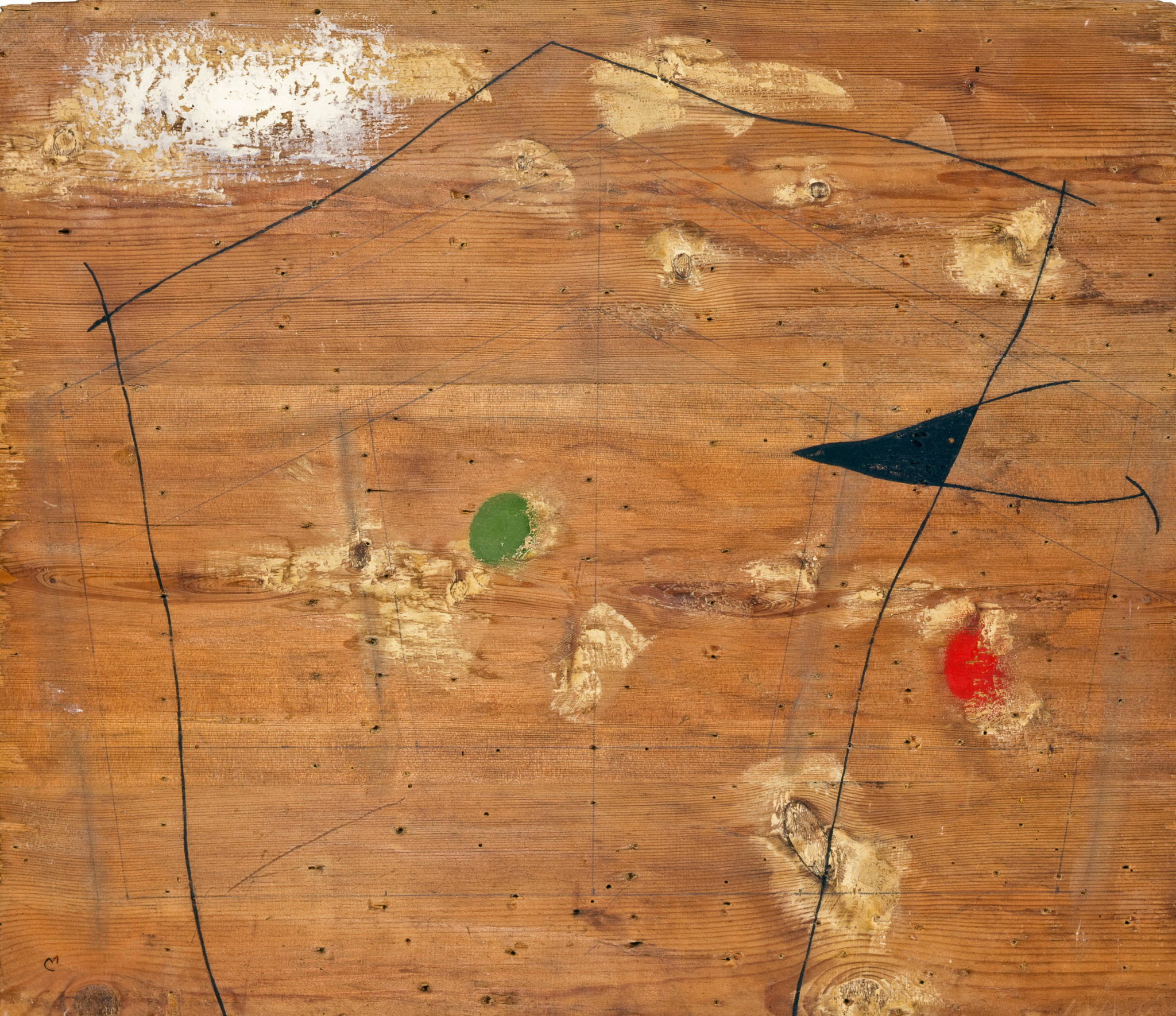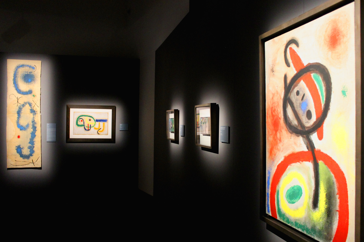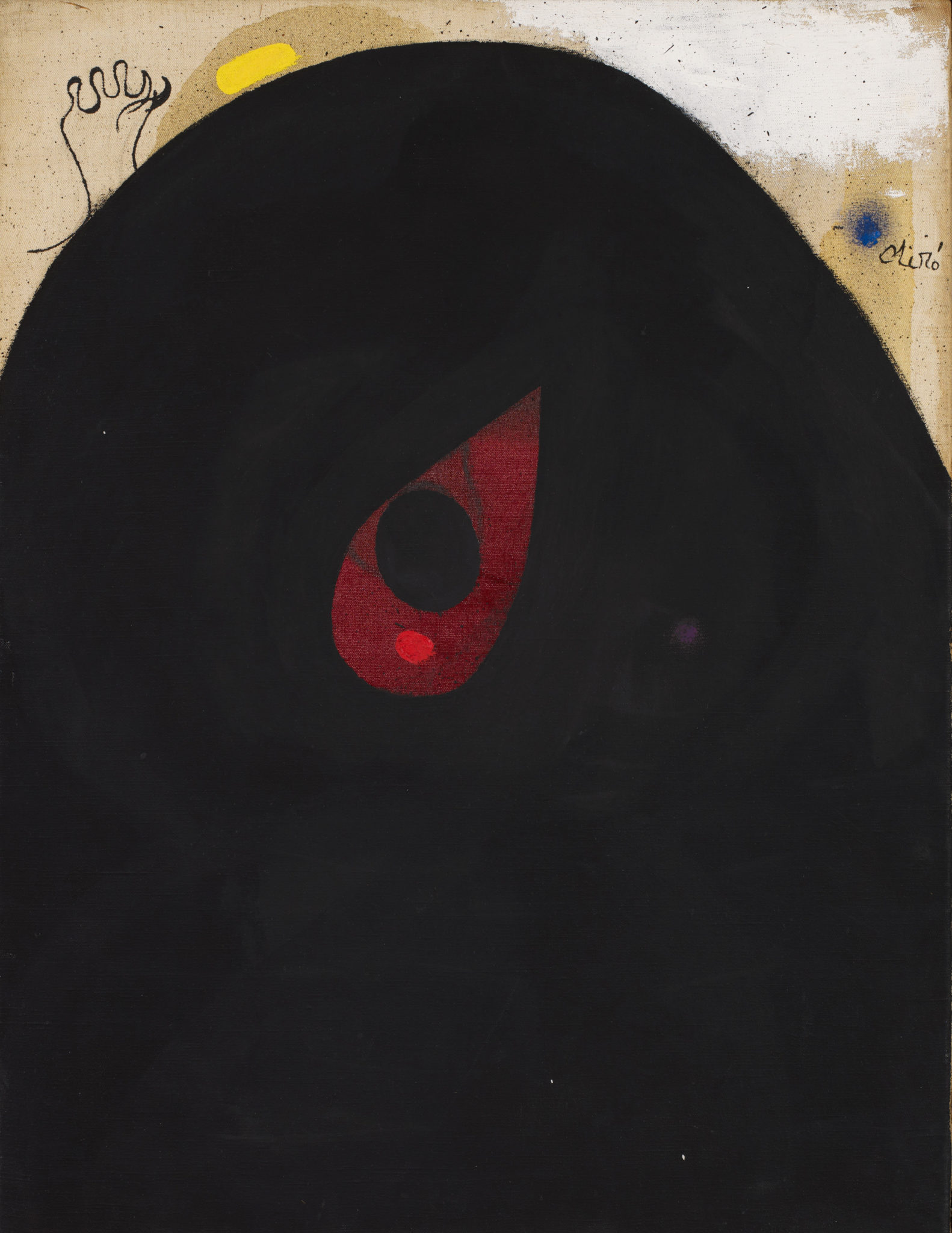 Miró con lei. In questi ultimi anni di vita mantenne la capacità di provocare e di creare un arte violenta e ribelle. Un vulcano in eruzione: la produzione fu anche e ancora più determinata. Lo si legge e respira in mostra. Nessuna autocelebrazione e fossilizzazione. Anzi, un frenetico ottantenne in preda a nuova giovinezza che brucia e lacera supporti e materiali disparati. Potenza e violenza sapientemente dosate nell’indole serena e irrequieta. Alla ricerca delle forme primordiali della materia. Forme che si impongono. Raschiandole affiorano. Tracciando si delineano. L’apparente semplicità e ingenuità di queste racchiude una complessità alchemico-poetica frutto di un inconscio calcolato, sorretto da un lavoro e un’incessante meditazione. Miró è artista assolutamente metodico a dispetto dell’apparenza anarchica, ingenua, infantile. Nulla è lasciato al caso, o quasi. L’arte ha bisogno di forza fisica e di allenamento. Poi un lampo improvviso e dirompente libera la magia. Pochi colori puri, composizioni oniriche nel blu, rosso, giallo e verde e la tela danza. Esplosioni di colore condotte attraverso un gesto impetuoso e brutale. Vibra la materia e si fa lirica. La poesia si fonde con la pittura. Il disegno, potere magico della matita, le celebra entrambe.