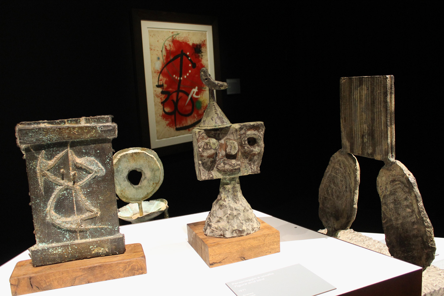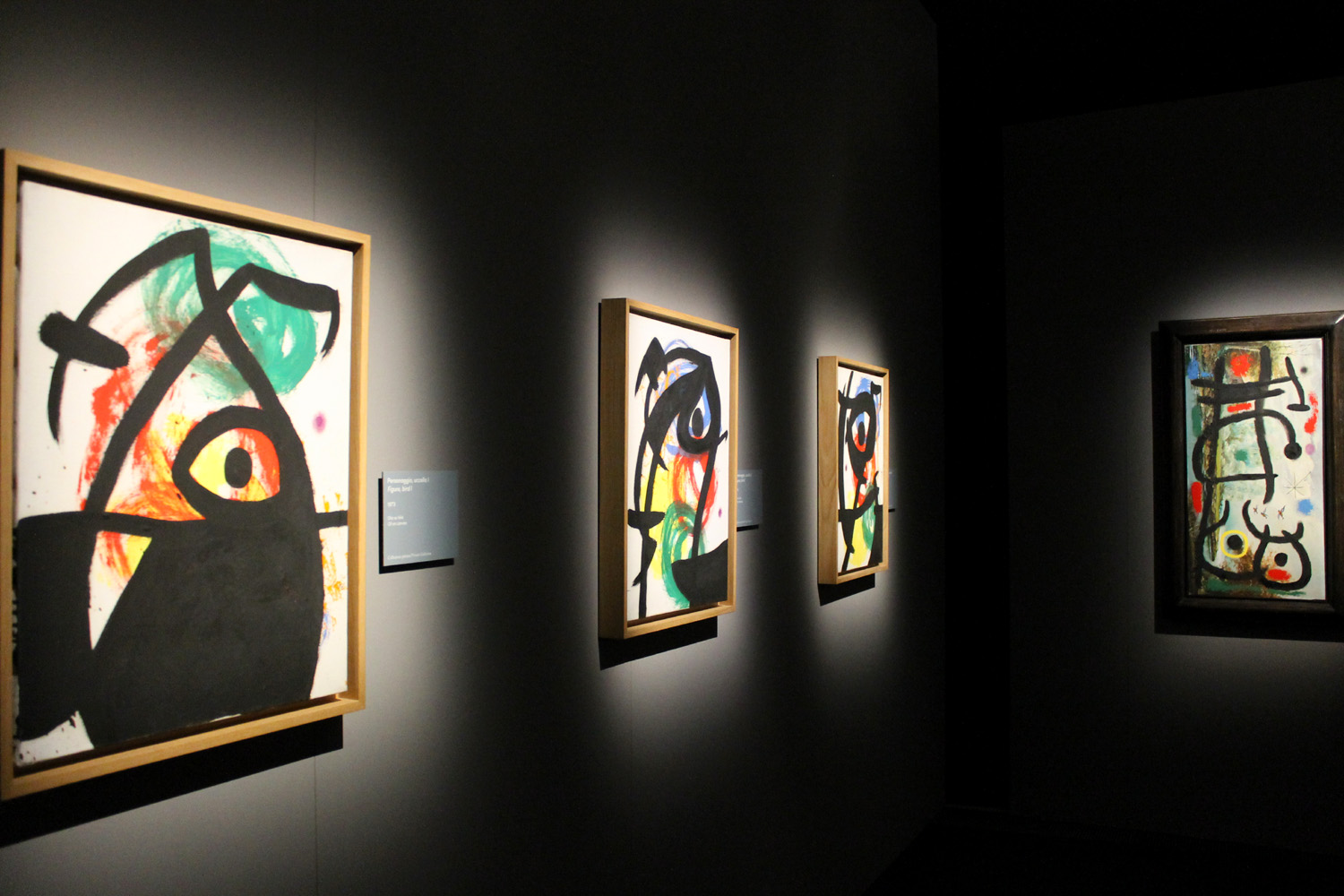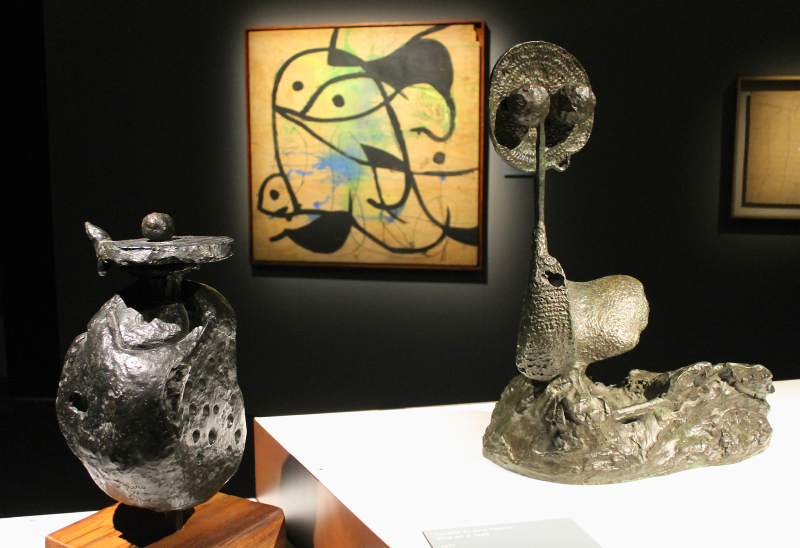 Assemblaggio e costruzione. Come la scultura. Universo di riciclo e l’aura avvolge lo scarto scolpito. Eterna sperimentazione dove si realizza l’alfabeto Miró. Segni, punti, linee, tratti. Il gesto e il processo. Miroglifici, miroglyphique come scrisse Raymond Queneau nel 1949. Simboli che evocano linguaggi ermetici, a lampi accessibili alle porte della ragione. Scavano nel sogno quanto la mente vi naufraga. Con le sue incursioni nel mondo onirico Mirò recupera personaggi perduti, evasi dalla cornici materiali e dalle reti censorie del super-ego umano. Violenza e intimità palpitano nelle opere dando voce a quella spiritualità primitiva che si nasconde nell’angolo più intimo della nostra anima. Trasversale, ancestrale: accarezza ognuno di noi sfruttando la materia in ogni suo plasma tecnico. Leggere l’etichette delle opere esposte per capire: olio, acquatinta, acquaforte, carburi, tela, carta, cartone, cera, pastello, china, inchiostri, acquerello, matita, guazzo, grafite, mastice, stoffa, acrilico, tavola, catrame, plastica, spago, nastro, metallo, argilla. Le forme dell’alfabeto di Mirò germogliavano sulle lastre di rame. Il bronzo piumato di un gallo segna le curve di una luna dipinta. Nella Notte scolpita in una testa, brillano calligrafie tessute nell’olio. Miró è un “classico” certo – la sua opera colpisce tutti perché è universale – ma è soprattutto un “magico“. Ha acceso la materia grezza donandole un’anima eterna, comprensibile a tutti.
