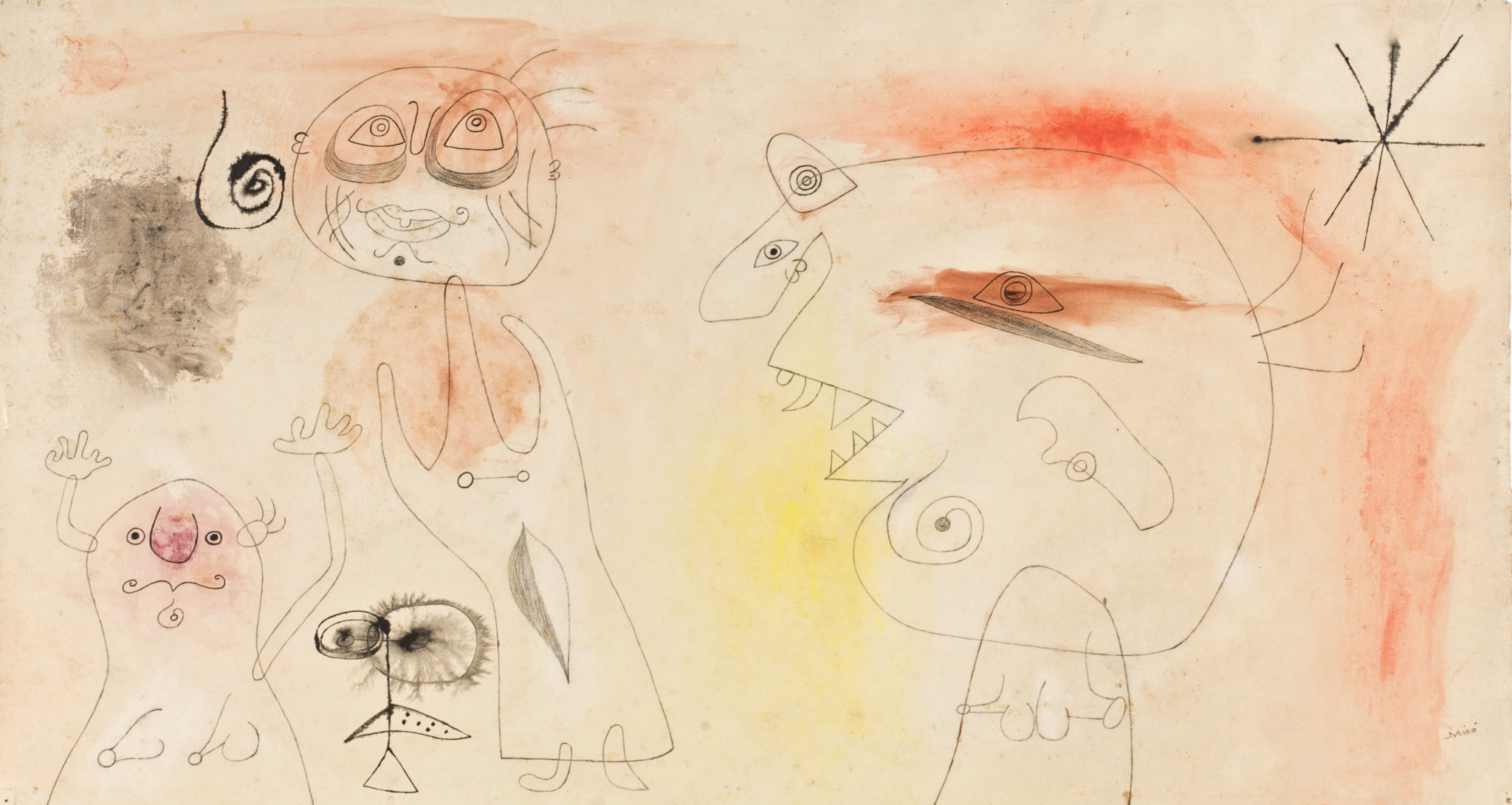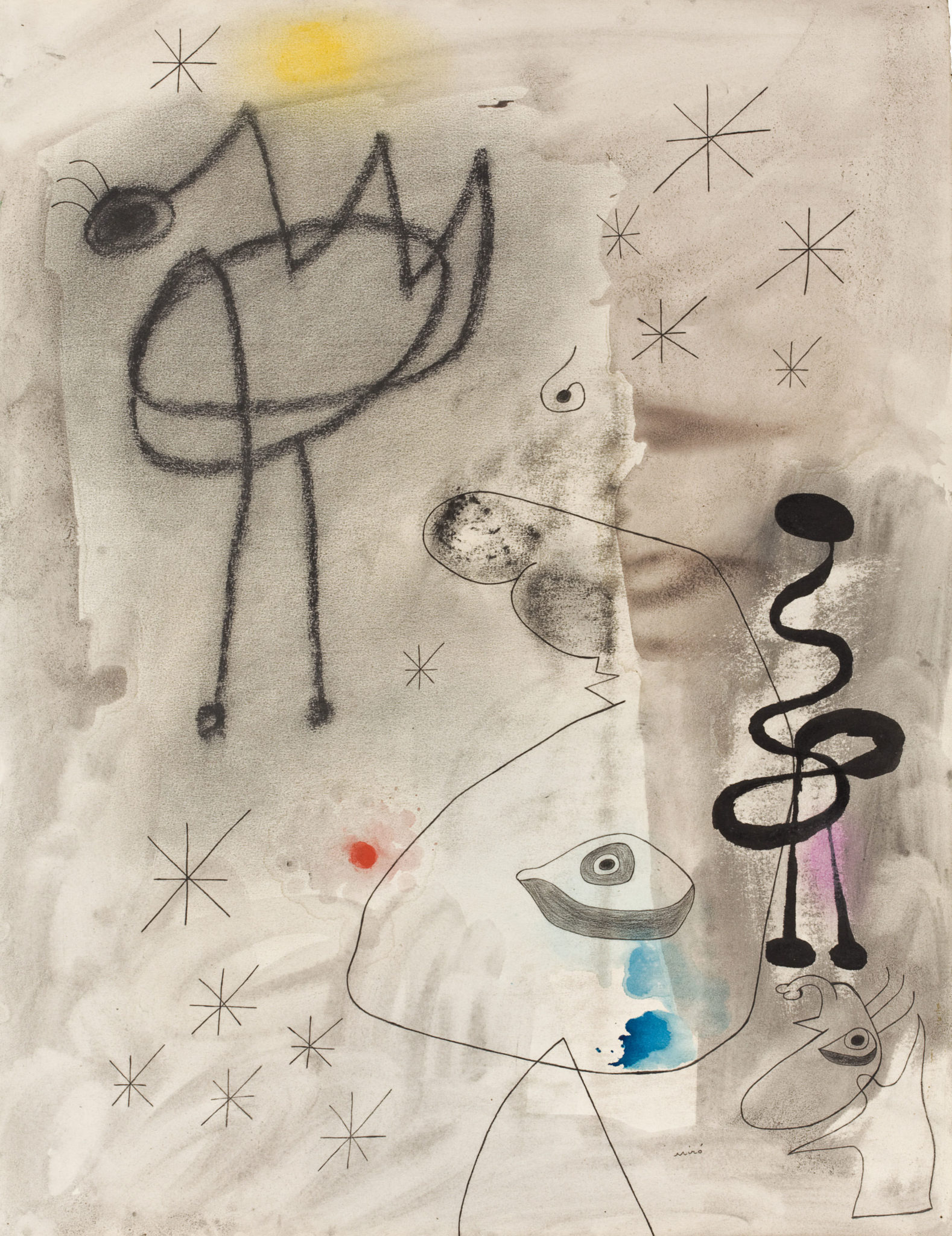 Joan Miró, Donna nella notte, 1973; Due personaggi perseguitati da un uccello, 1976*