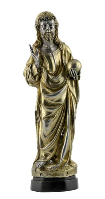 Ritornata al suo splendore originario grazie ad un recente restauro che ne ha riportato alla luce la doratura, la piccola scultura in lamina d’argento sbalzato, inciso e dorato raffigurante Cristo Redentore è opera di Nicola da Guardiagrele, orafo abruzzese formatosi presso il Ghiberti. Dal punto di vista tecnico, la relazione con le sette croci processionali realizzate dall’artista di Guardiagrele è indubbia, anche se alcuni elementi, quali la cascata di pieghe sinuose della veste, si caratterizzano per essere creazioni di grande originalità. La classicheggiante bellezza della testa della figura, con i capelli e la barba ripartiti con studiata simmetria, la fronte corrugata e gli occhi sporgenti, collocano l’opera in una fase più matura e tarda dell’artista, verso la metà del XV secolo. La precisa e minuziosa decorazione a graffito dell’orlo della tunica, l’agile leggerezza della scultura, il movimento aggraziato della figura con il piede che emerge appena da sotto la veste, dimostrano l’alta sapienza tecnico-artistica dell’orafo e suggeriscono l’appartenenza di questo Cristo Redentore ad un insieme più complesso di cui purtroppo però si sono perdute le tracce.