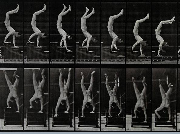 Se l’esordio nella fotografia di Eadweard Muybridge, inglese, emigrato negli States, è documentato dalle sue immagini bucoliche nella valle di Yosemite, in California, scattate tra il 1867 e il 1868 la sua fama di sperimentatore deriva invece da una sua verifica curiosa effettuata per il governatore della California nel 1878 per dimostrare se nel galoppo, tutte e quattro le zampe del cavallo risultassero contemporaneamente alzate rispetto al suolo, come le aveva dipinte, per esempio, l’artista francese Théodore Géricault nel dipinto Il Derby a Epson (1821). Da lì l’ esperimento. Utilizzando 24 fotocamere collegate ad altrettanti fili lungo il percorso, Muybridge ottiene una sequenza di immagini che documentano con assoluta precisione il movimento dei cavalli, confermando che per alcuni istanti effettivamente nel galoppo l’intero loro corpo risulta sollevato dal suolo, ma indicando anche che l’estensione delle zampe risulta del tutto diversa da quella immaginata agli artisti. Queste immagini gli danno la celebrità e dopo i cavalli, Muybridge si dedica agli uccelli in volo e al movimento degli animali dello Zoo di Philadelphia. Poi il soggetto diventa l’uomo. Divennero presto celebri i suoi nudi in movimento, fotografati su uno sfondo con una griglia disegnata, mentre correvano, salivano le scale o portavano secchi d’acqua. Con la collaborazione dell’Università di Pennsylvania, Muybridge progetta llo Zoopraxiscopio, uno strumento simile allo Zoetropio, che consentiva di proiettare le immagini, rendendole così contemporaneamente visibili a un piccolo pubblico. Come al cinema.