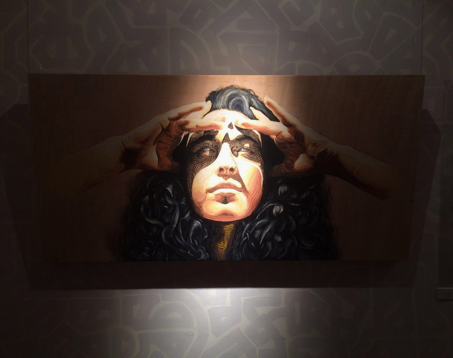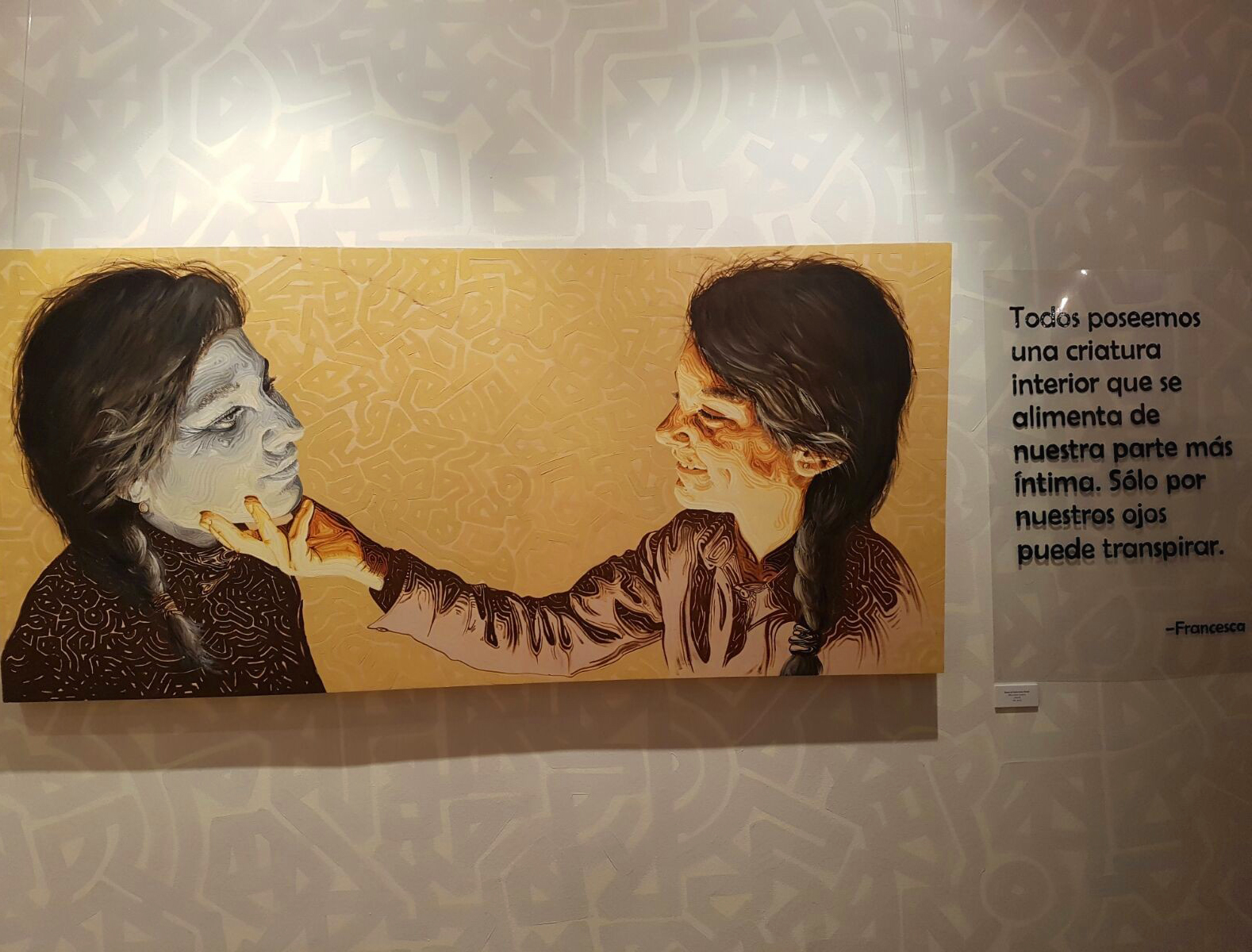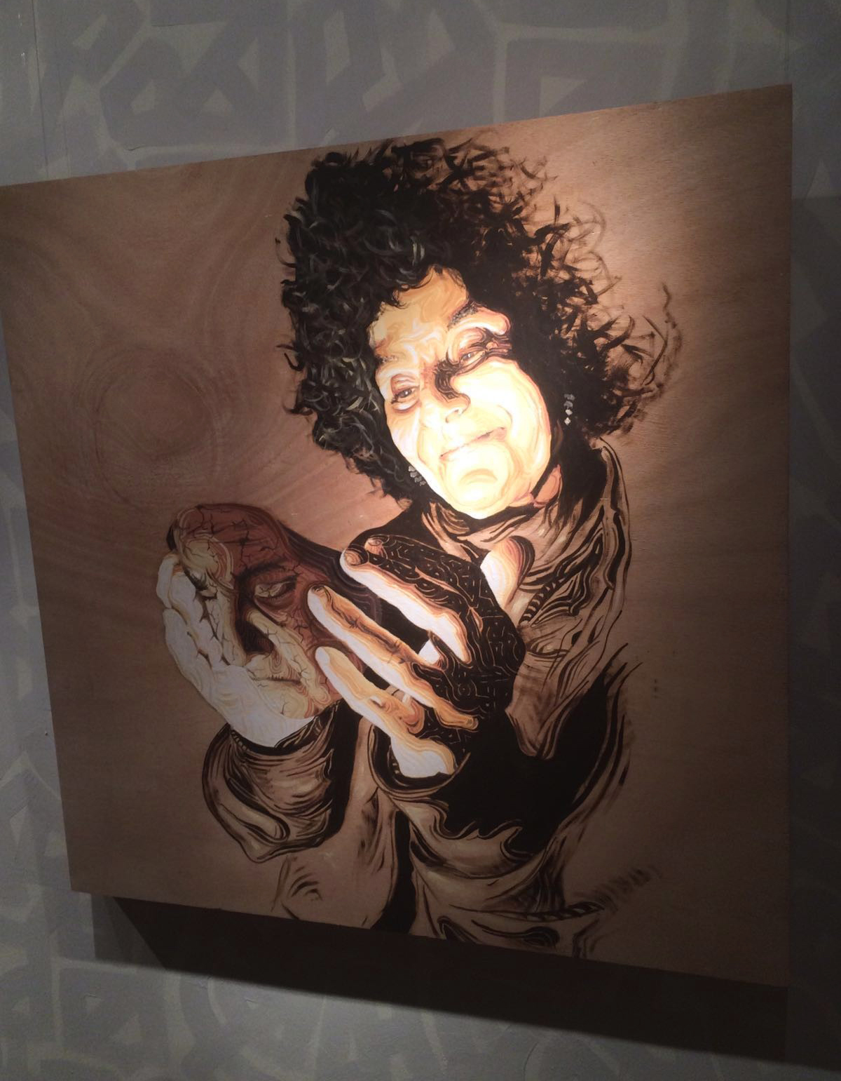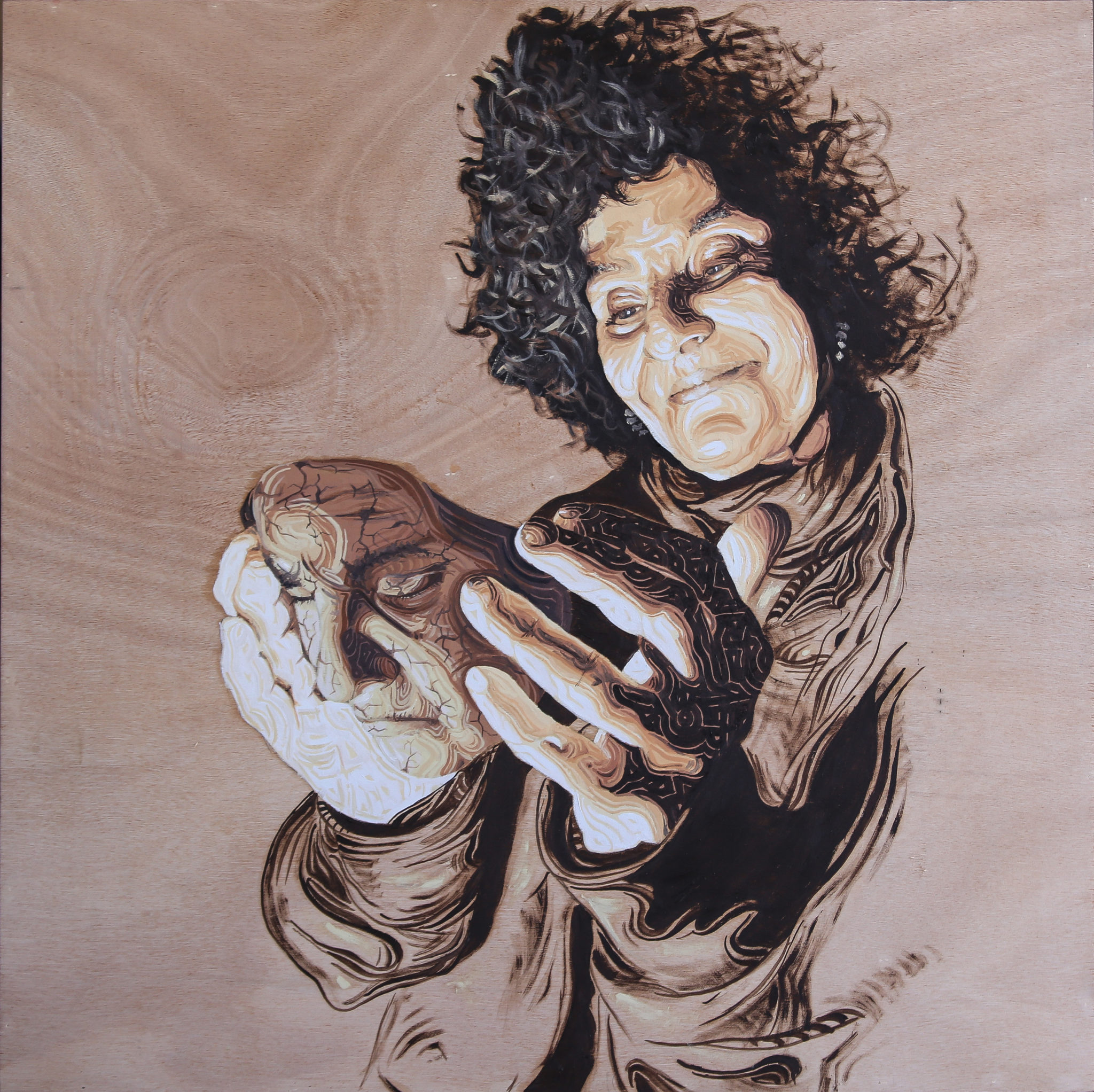 Una pittura che illumina solcando le geometrie precolombiane -marchio di fabbrica dell’artista-, navigando nelle pieghe della figurazione più esplicita. Nelle ragnatele impresse su iuta grezza e nelle venature del legno prendono vita fecondi dialoghi tra il volto e le mani. Dialettiche tra fonti energetiche frutto di incroci e riflessi col taglio degli sguardi e le fessure nei petti. Tutto nel segno del decorativismo reticolato: labirinti che creano fondi intricati che penetrano nella pellicola dei soggetti e nei tessuti delle vesti e dei visi scavati o ricamati nella linea. Mani e volti saturi del quid vitale da cui ha origine l’opera. Concentrata in esse, spandibile nelle vesti, nella pelle e nei corpi, per fluire nelle chiome e perdersi nei segni labirintici che inquadrano le figure. Una pittura decisa quanto delicata, frutto di una tecnica affinata tra Sudamerica e Stati Uniti, durante il lungo peregrinare alla ricerca di una fonte, poetica ed artistica. Risultato chiaro e godibile in mostra: una miscela matura che ad una formazione “classica” europea, aggiunge una dose di street art statunitense, presente fin dagli esordi milanesi, per definirsi nell’intrigo geometrico di stampo greco-azteco e nei sinistri calaveras messicani. Giorni dei Morti affogati nel colore e incisi su iuta e sul legno. Iconografie intrise di sacro nelle quali una maniacale ricerca del dettaglio e una poetica intimista conferisce una luce dolce e lirica.