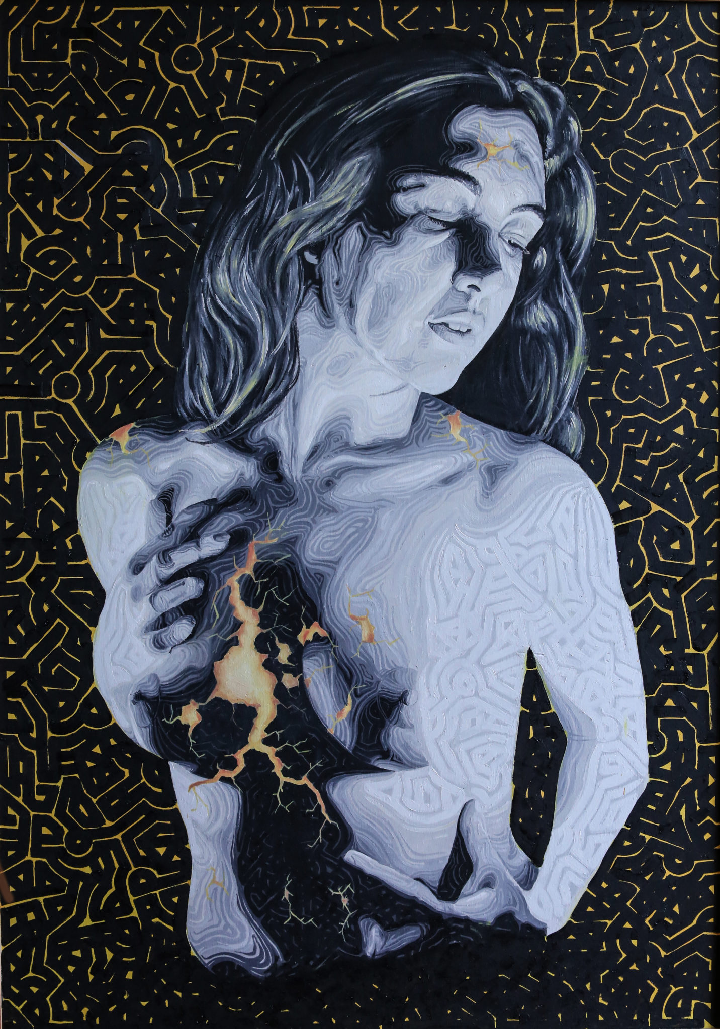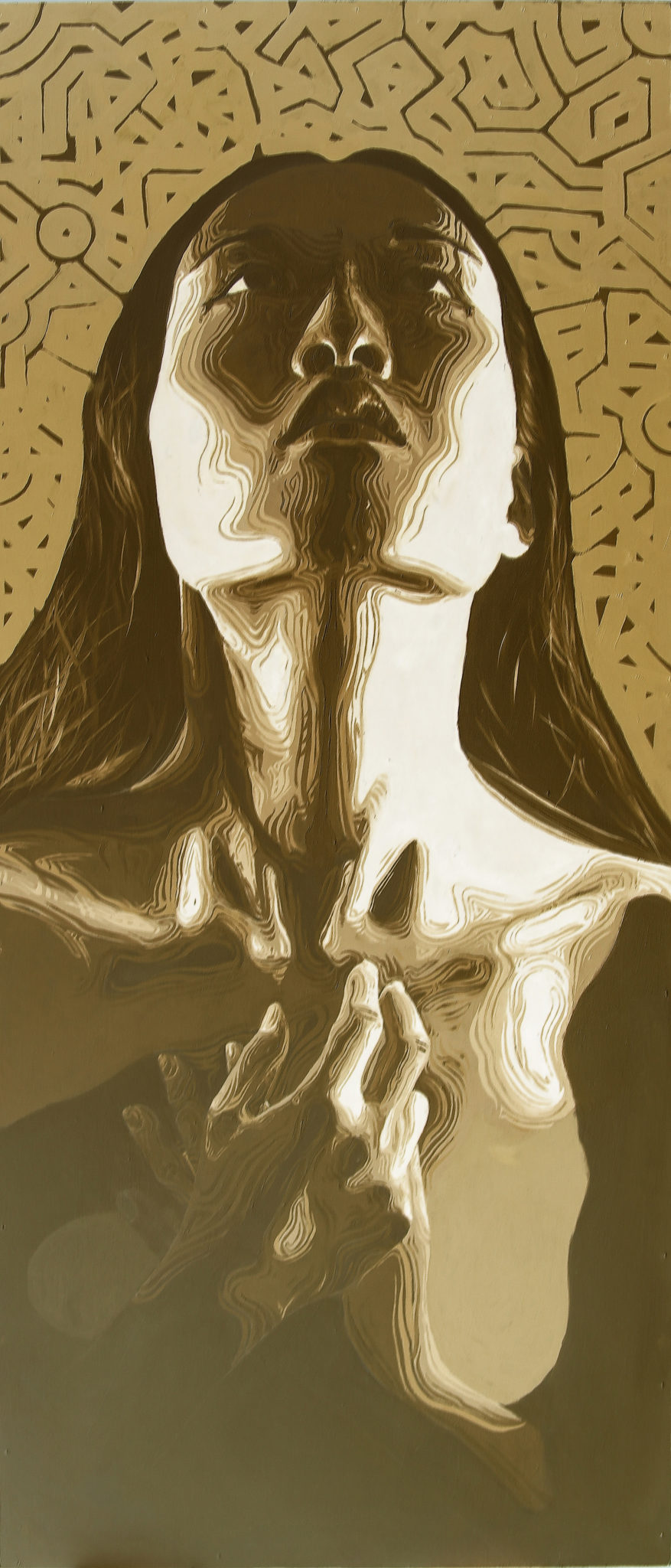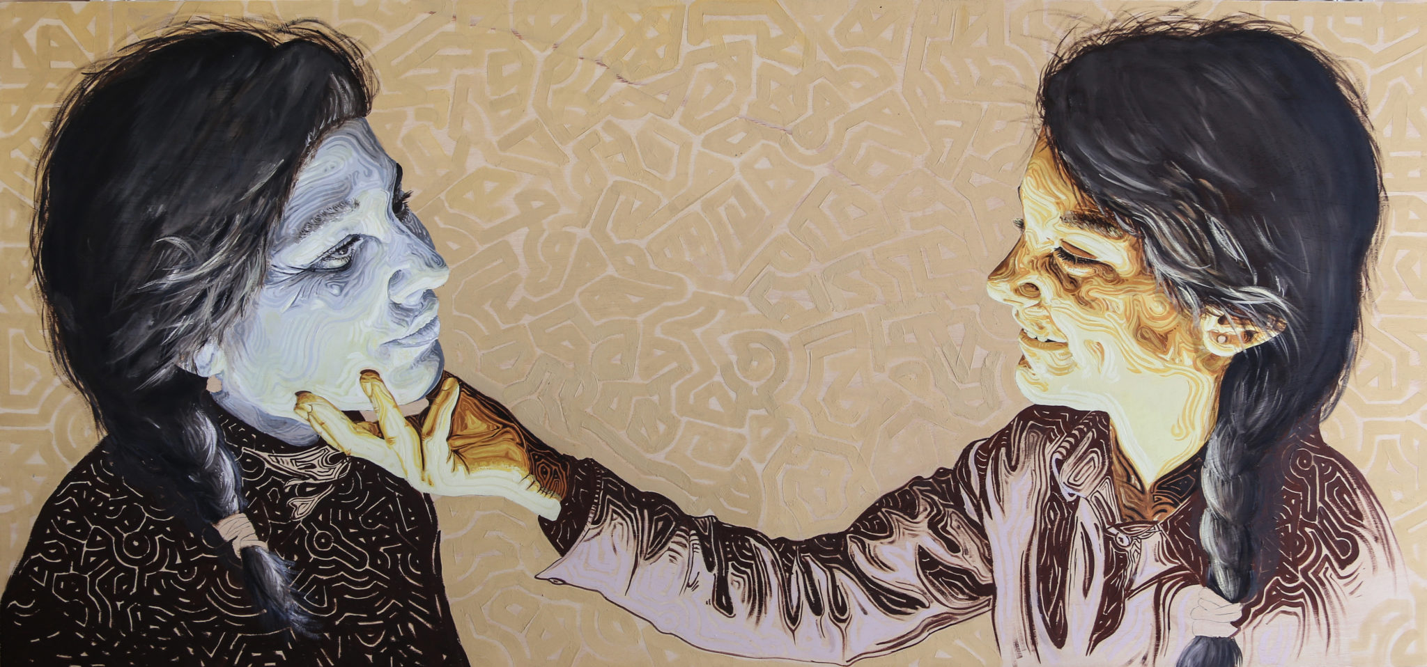 Una pittura che illumina solcando le geometrie precolombiane -marchio di fabbrica dell’artista-, navigando nelle pieghe della figurazione più esplicita. Nelle ragnatele impresse su iuta grezza e nelle venature del legno prendono vita fecondi dialoghi tra il volto e le mani. Dialettiche tra fonti energetiche frutto di incroci e riflessi col taglio degli sguardi e le fessure nei petti. Tutto nel segno del decorativismo reticolato: labirinti che creano fondi intricati che penetrano nella pellicola dei soggetti e nei tessuti delle vesti e dei visi scavati o ricamati nella linea. Mani e volti saturi del quid vitale da cui ha origine l’opera. Concentrata in esse, spandibile nelle vesti, nella pelle e nei corpi, per fluire nelle chiome e perdersi nei segni labirintici che inquadrano le figure. Una pittura decisa quanto delicata, frutto di una tecnica affinata tra Sudamerica e Stati Uniti, durante il lungo peregrinare alla ricerca di una fonte, poetica ed artistica. Risultato chiaro e godibile in mostra: una miscela matura che ad una formazione “classica” europea, aggiunge una dose di street art statunitense, presente fin dagli esordi milanesi, per definirsi nell’intrigo geometrico di stampo greco-azteco e nei sinistri calaveras messicani. Giorni dei Morti affogati nel colore e incisi su iuta e sul legno. Iconografie intrise di sacro nelle quali una maniacale ricerca del dettaglio e una poetica intimista conferisce una luce dolce e lirica.