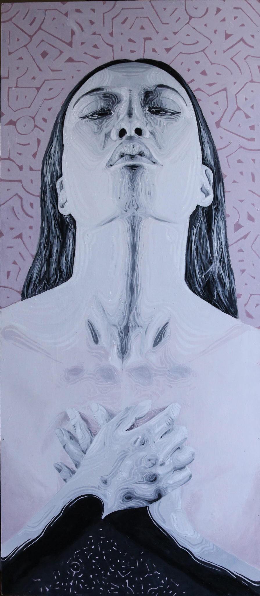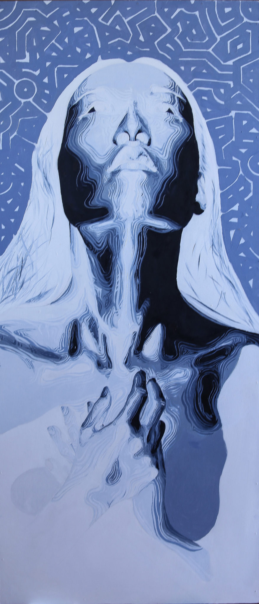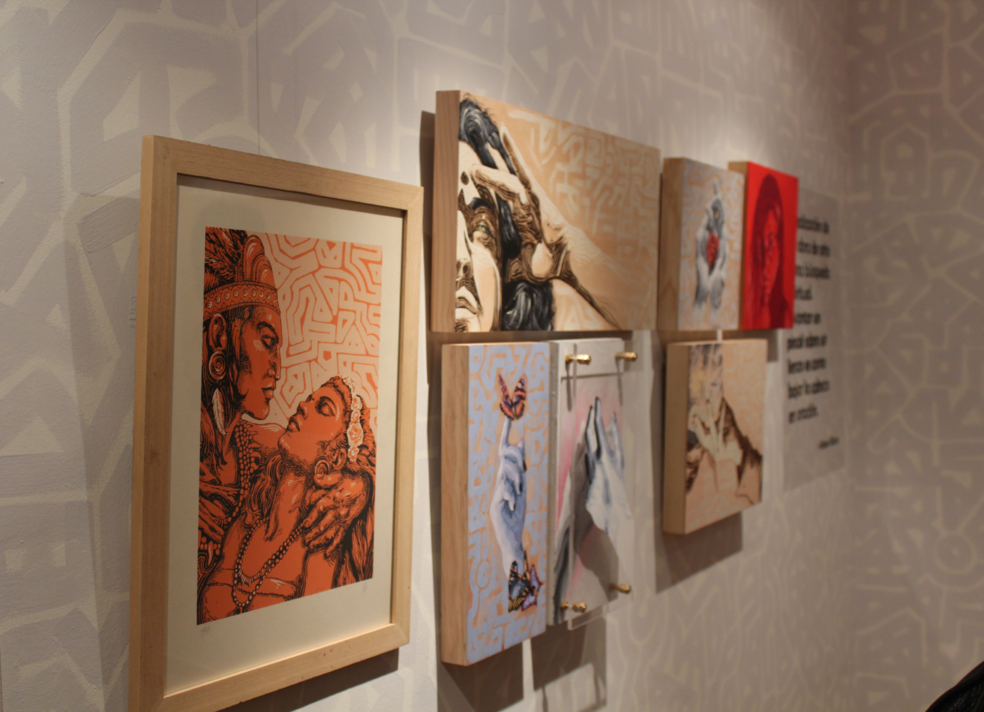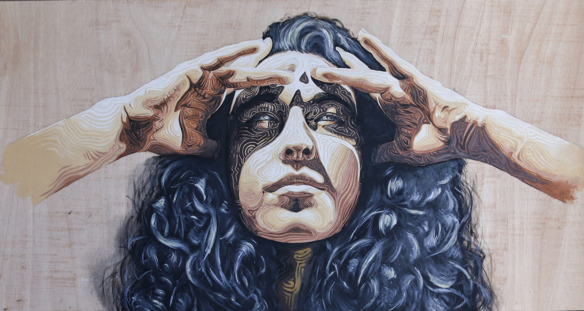 Una pittura che illumina solcando le geometrie precolombiane -marchio di fabbrica dell’artista-, navigando nelle pieghe della figurazione più esplicita. Nelle ragnatele impresse su iuta grezza e nelle venature del legno prendono vita fecondi dialoghi tra il volto e le mani. Dialettiche tra fonti energetiche frutto di incroci e riflessi col taglio degli sguardi e le fessure nei petti. Tutto nel segno del decorativismo reticolato: labirinti che creano fondi intricati che penetrano nella pellicola dei soggetti e nei tessuti delle vesti e dei visi scavati o ricamati nella linea. Mani e volti saturi del quid vitale da cui ha origine l’opera. Concentrata in esse, spandibile nelle vesti, nella pelle e nei corpi, per fluire nelle chiome e perdersi nei segni labirintici che inquadrano le figure. Una pittura decisa quanto delicata, frutto di una tecnica affinata tra Sudamerica e Stati Uniti, durante il lungo peregrinare alla ricerca di una fonte, poetica ed artistica. Risultato chiaro e godibile in mostra: una miscela matura che ad una formazione “classica” europea, aggiunge una dose di street art statunitense, presente fin dagli esordi milanesi, per definirsi nell’intrigo geometrico di stampo greco-azteco e nei sinistri calaveras messicani. Giorni dei Morti affogati nel colore e incisi su iuta e sul legno. Iconografie intrise di sacro nelle quali una maniacale ricerca del dettaglio e una poetica intimista conferisce una luce dolce e lirica.