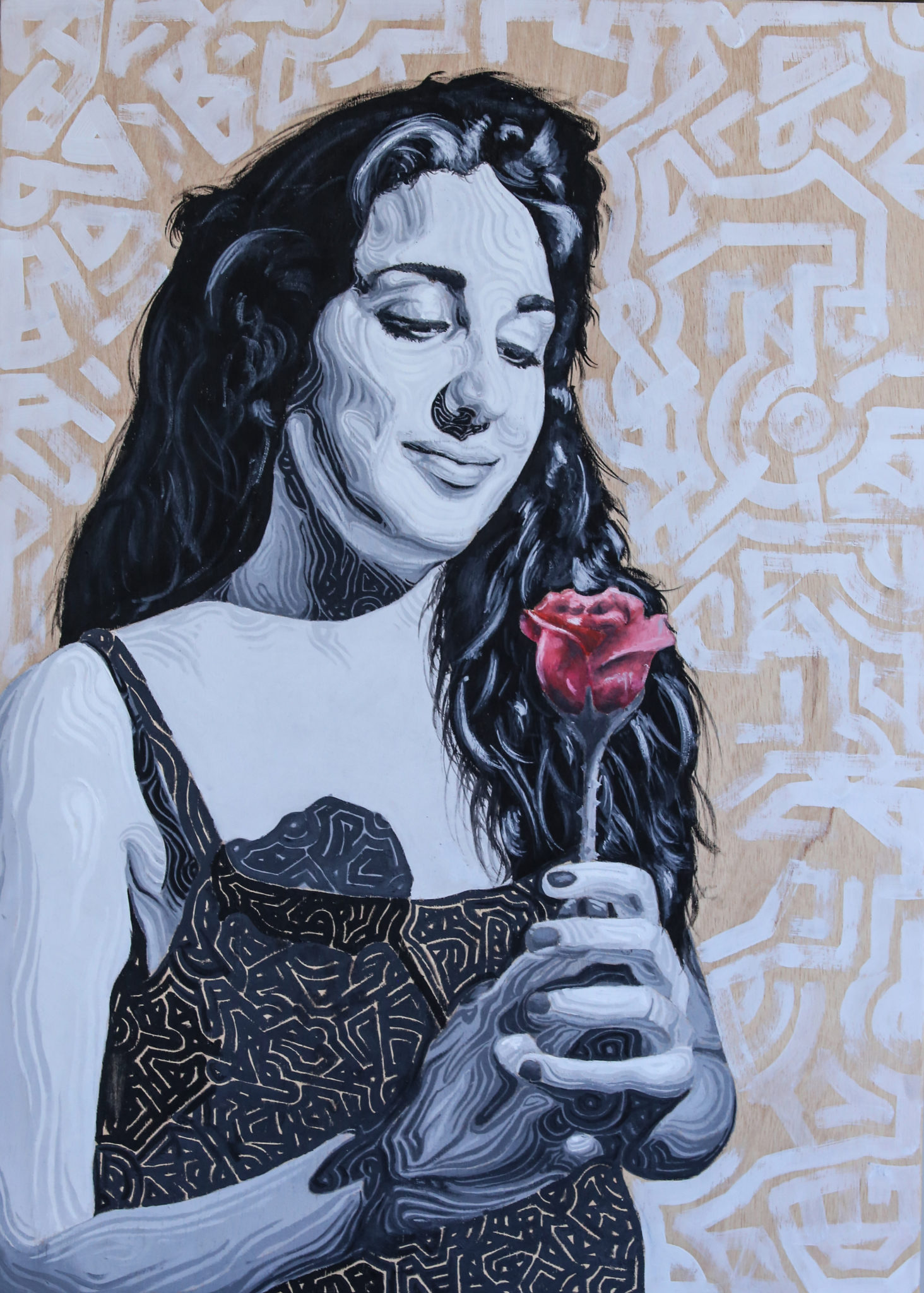 La tematica dell’esposizione l’ho sempre tenuta ben chiara. Ho cercato di affrontarla a mio avviso nella maniera più semplice possibile, lavorando con persone a me vicine provando a rappresentarle con le loro forze e debolezze, quello che vogliono mostrare alla gente e quello che secondo me davvero sono. Quest’argomento mi coinvolge anche da vicino, in un paio di opere ho dipinto dei momenti importanti della mia vita che mi hanno segnato, raffigurandoli con mia madre e una ragazza che tiene in mano una rosa che rappresenta mio padre a cui ho dedicato l’esposizione.