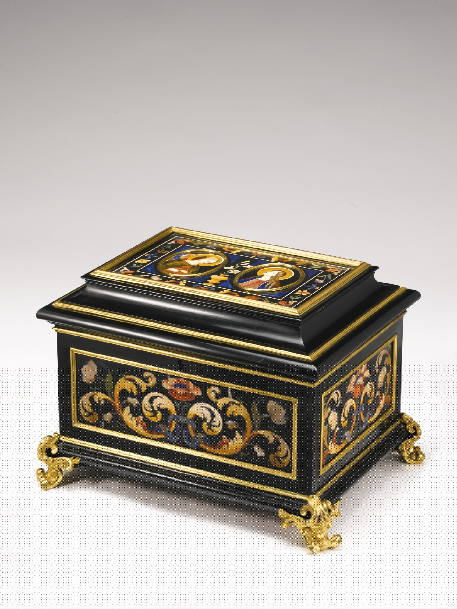 Cofanetto in commesso di pietre dure, ebano e applicazioni in bronzo dorato, Botteghe Granducali, Firenze, primo quarto del XVIII secolo