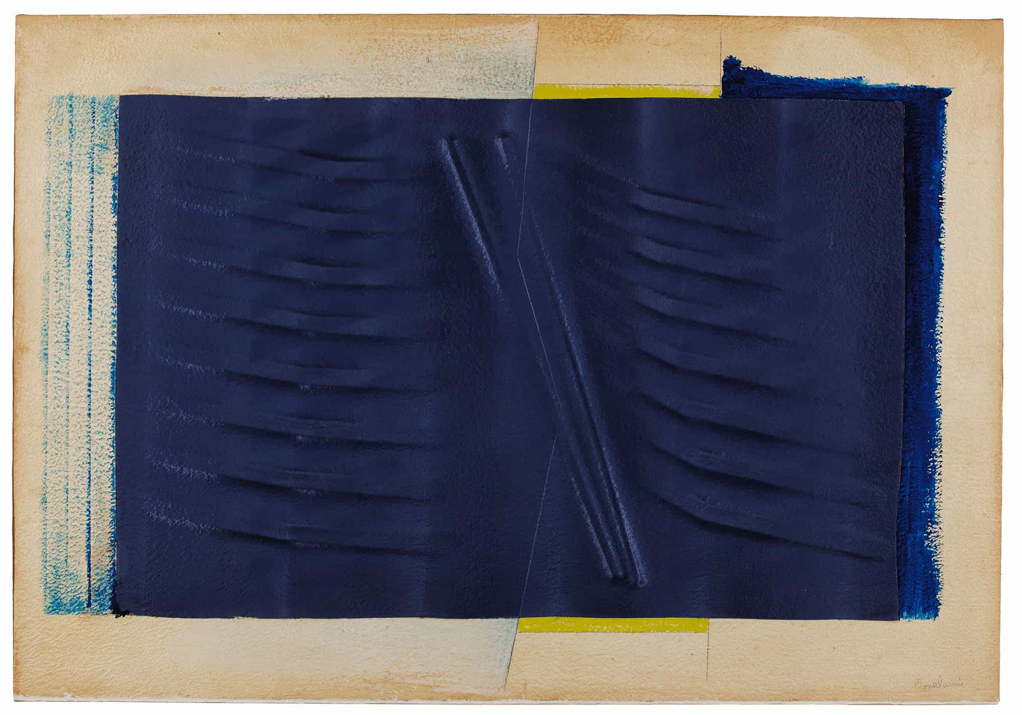 Tempera e collage di seta su carta intelata estroflessa, cm 65 x 94 Firmato in basso a destra
