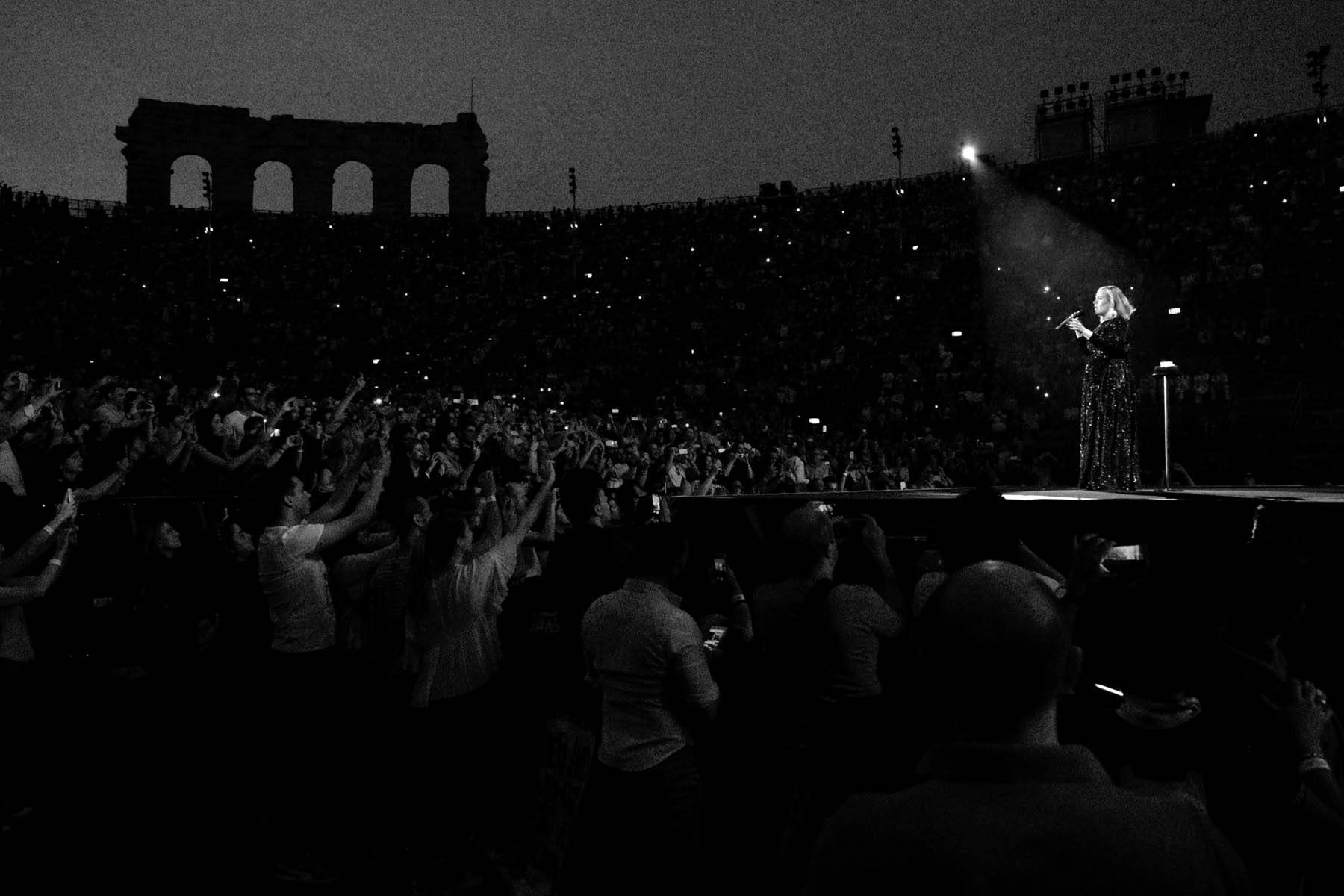 Davanti a uno schermo che ne rilancia il volto ben truccato, lo sguardo penetrante, in rigoroso bianco e nero quasi sino alla fine, Adele racconta la vita al gradino più elementare: «Ci sono momenti in cui devi liberarti di qualcuno, lasciami sola accidenti, e credetemi, li abbiamo tutti». Così suonano “Hometown Glory”, “Don’t You Remember”, “Make You Feel Me Love” di Bob Dylan, «quando l’ho ascoltata ho avuto un tuffo al cuore…», “Chasing Pavements” e “When We Were Young” dove la si vede bambina, ragazza e futura madre: «Chissà come sarò a trenta o sessant’anni…?».
