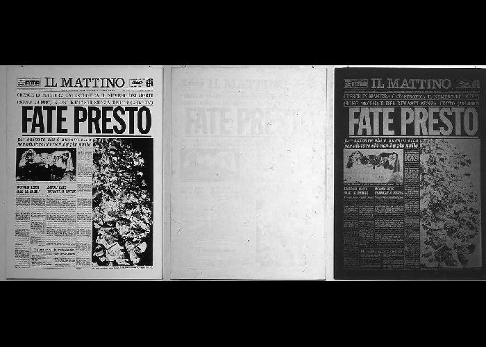 Fate Presto sembra essere l’opera più indicativa di tutta la collezione. Andy Warhol attraverso il suo linguaggio immediato affida l’interpretazione del tragico evento alle pagine dei giornali in particolare quelle del quotidiano napoletano. Il risultato è la realizzazione di un trittico moderno nato nella sua Factory a New York. L’opera è coerente con tutta la sua produzione: l’artista ha prelevato dalla realtà ciò che per la gente risulta essere l’elemento familiare come la prima pagina del quotidiano, per poi restituirlo in una chiave pop in una scala di grigi.