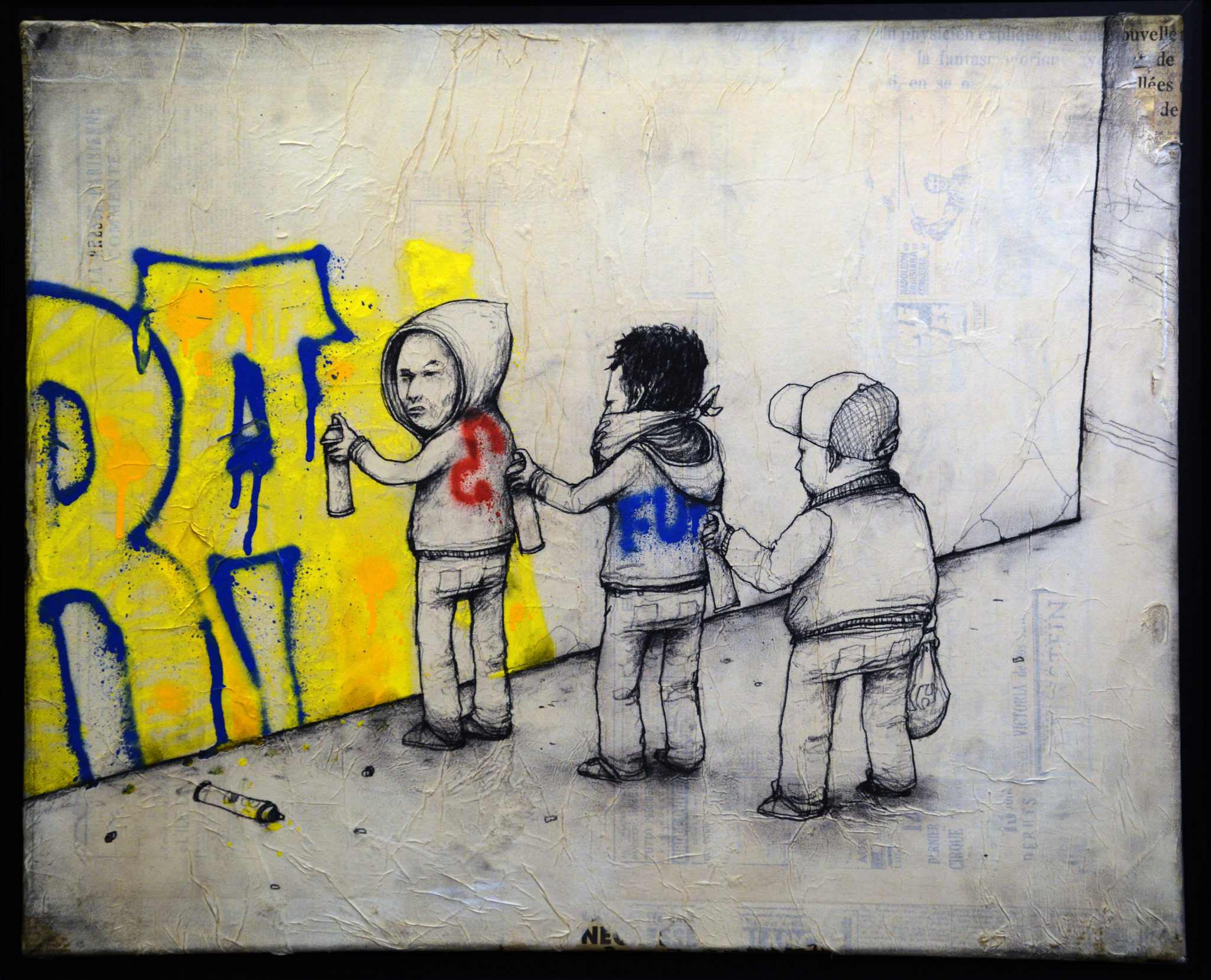 Os Gemeos sono due gemelli nati nel 1974 a San Paolo in Brasile dove hanno cominciato a dipingere graffiti dal 1987 influenzando questa tipologia d’arte e contribuendo a definire uno stile del Brasile. Il loro lavoro presenta spesso personaggi dalla pelle gialla – come The Guitar (2007, Amburgo, Reinking Collection) – e i soggetti spaziano da ritratti di famiglia, al sociale, alle politiche di San Paolo e al folklore brasiliano. In questa sezione anche opere del noto artista urbano Invader che semina in angoli di strade di tutto il mondo tasselli a mosaico che riproducono personaggi ispirati ai videogiochi arcade Space Invaders del 1978. In mostra opere come Black Extension (Collezione Jacques et Thierry, Parigi, 2009) congiuntamente ai lavori di Blek le Rat – grande influencer dei più famosi street artists – come Michelangelo with rats (1987, Courtesy Blek le Rat and Wunderkammern Gallery), accanto agli stencils del duo di Brooklyn Faile.