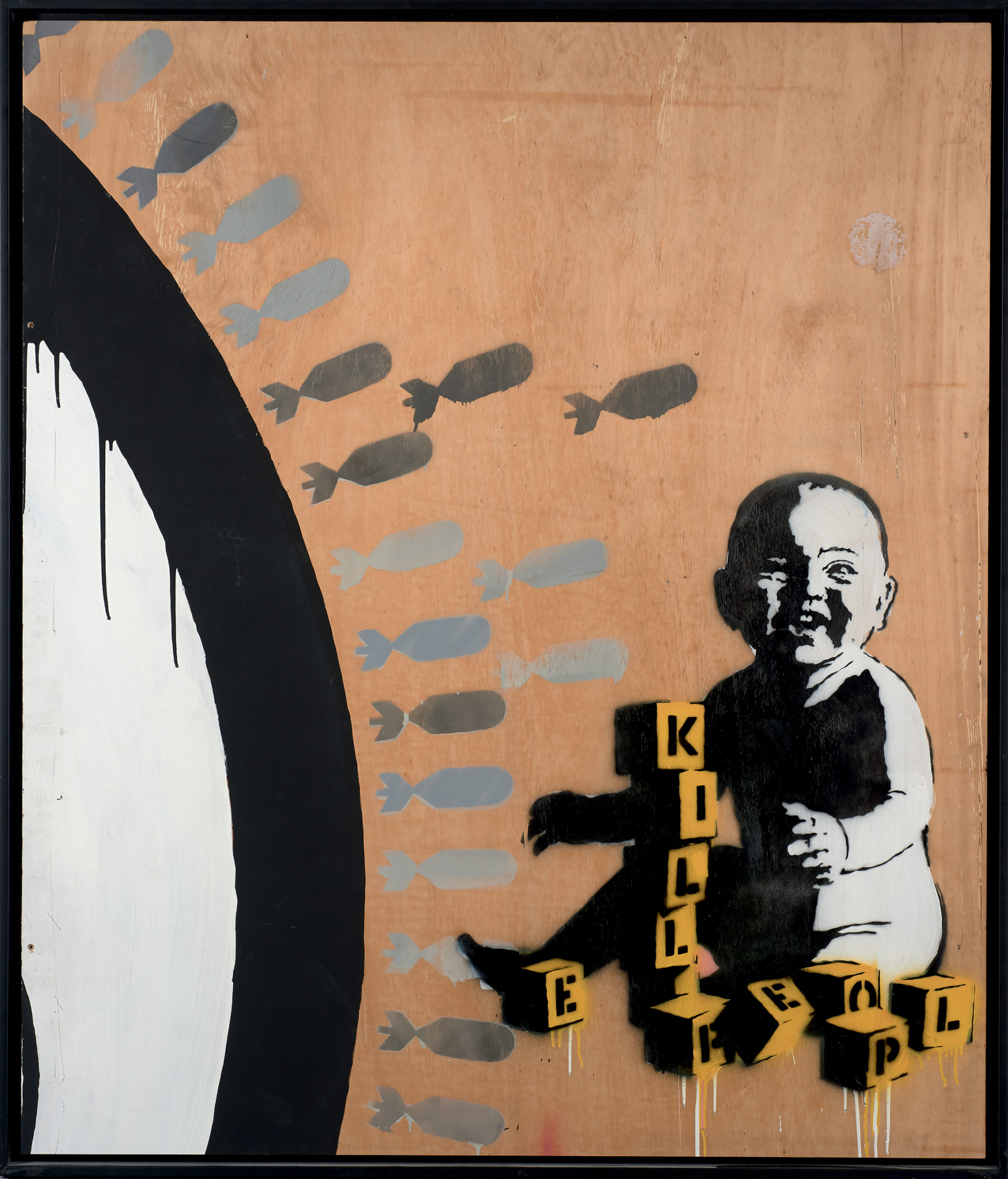 Banksy, di Bristol, classe 1974 è un artista inglese le cui opere sono spesso a sfondo satirico e riguardano argomenti come la politica, la cultura e l’etica. I suoi stencils sono comparse proprio a Bristol e nelle maggiori capitali europee e americane, non solo sui muri delle strade, ma anche nei posti più impensabili come le gabbie dello zoo di Barcellona. Sono i suoi famosi Rats – soggetto scelto dal grande Banksy e con il quale ha coperto tutta Londra – i protagonisti della prima parte di questa sezione, accanto a opere come Love is in the air, (2003, Parigi, Collezione privata) e Girl with gas mask, (2002, Amburgo, Reinking Collection).