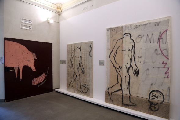 Blu è lo pseudonimo di un artista di Senigallia, considerato tra i migliori street artists al mondo. A lui è dedicata un’intera sala con i video prodotti negli anni 2000 e raccolti nel dvd Sketch Notebook (2010). Blu inizia a farsi conoscere a partire dal 1999 attraverso una serie di graffiti eseguiti nel centro storico di Bologna e in periferia, negli spazi occupati del centro sociale Livello 57. A partire dal 2001 le sue opere – eseguite con vernici e grazie a rulli montati su bastoni telescopici – coprono superfici pittoriche gigantesche: i suoi soggetti sono figure di umanoidi dai connotati sarcastici o talvolta drammatici il cui immaginario sembra ispirarsi al mondo dei fumetti e dei videogiochi. In mostra l’opera di Blu Senza titolo del 2006 proveniente da Bologna (Associazione Italian Graffiti) copre un grande muro alto 12 metri.